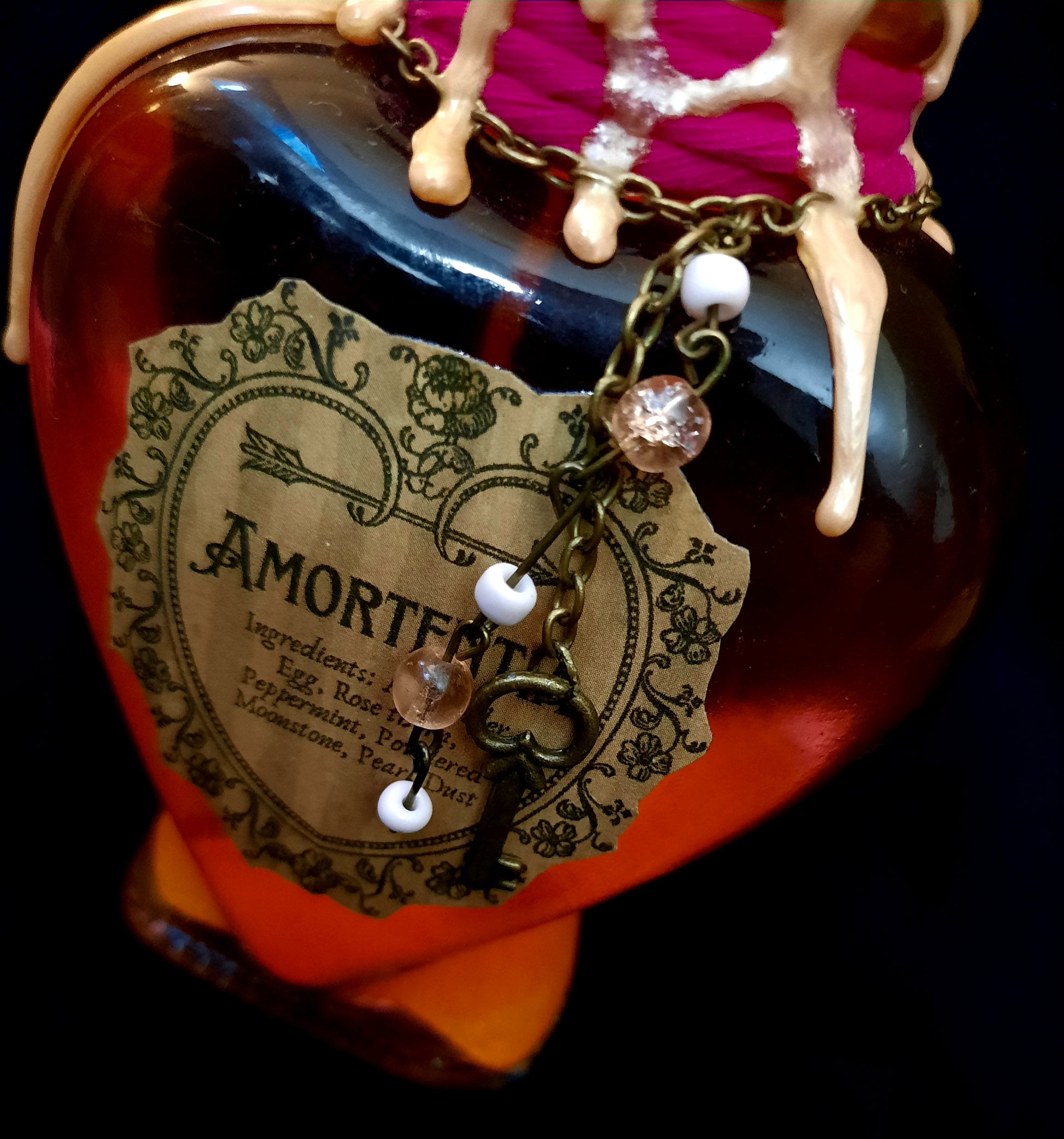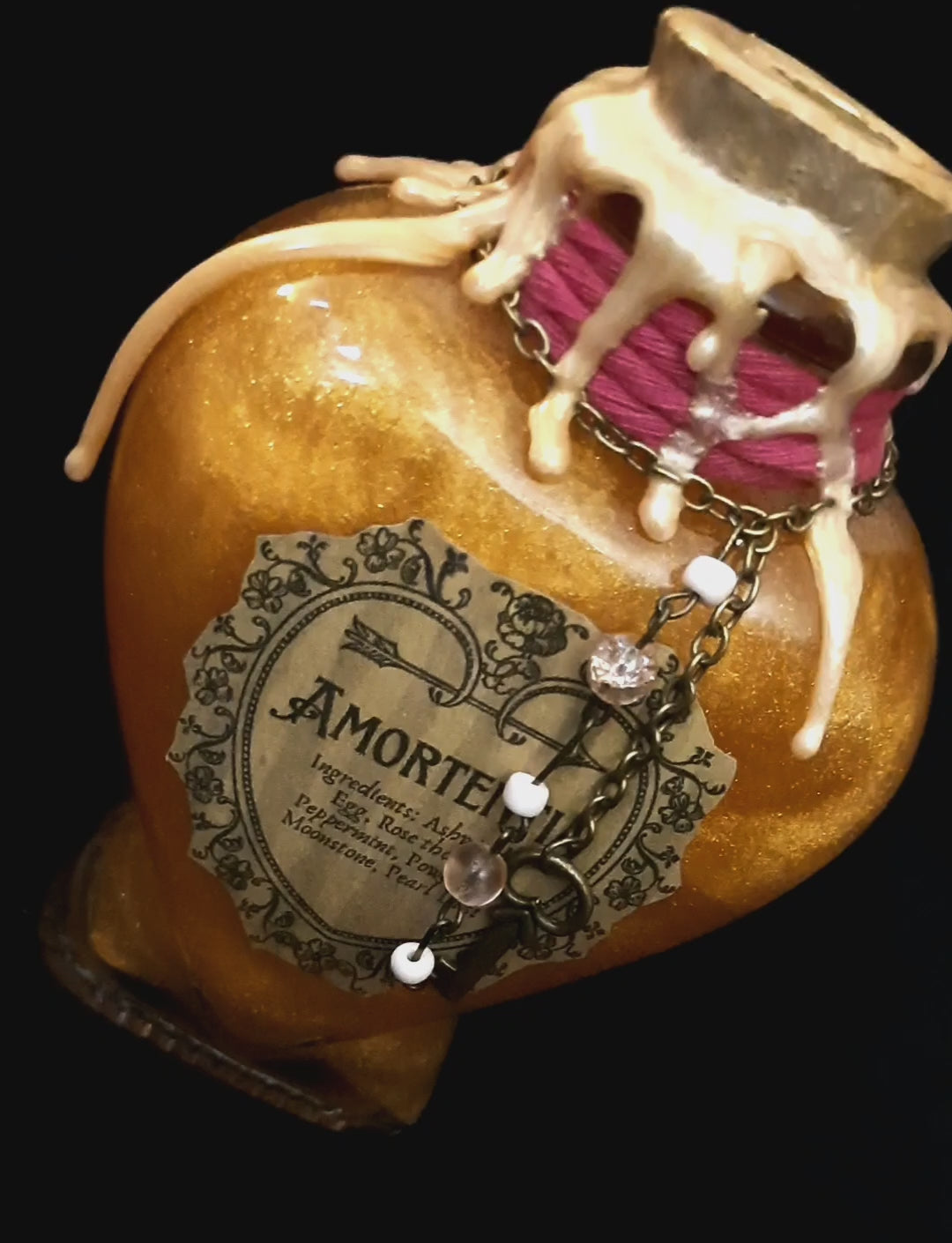 Amortentia Potion Bottle is a glass heart shaped bottle filled with a light pink potion that swirls to a shimmery golden when shaken. The shimmer will settle back down to the bottom of the bottle in about 10 minutes, until shaken again. This bottle is adorned with hot pink chord, bronze chain, light pink crystal beads, white glass beads, and 1 bronze key charm. The bottle is sealed with light pink wax with a gold heart stamp.