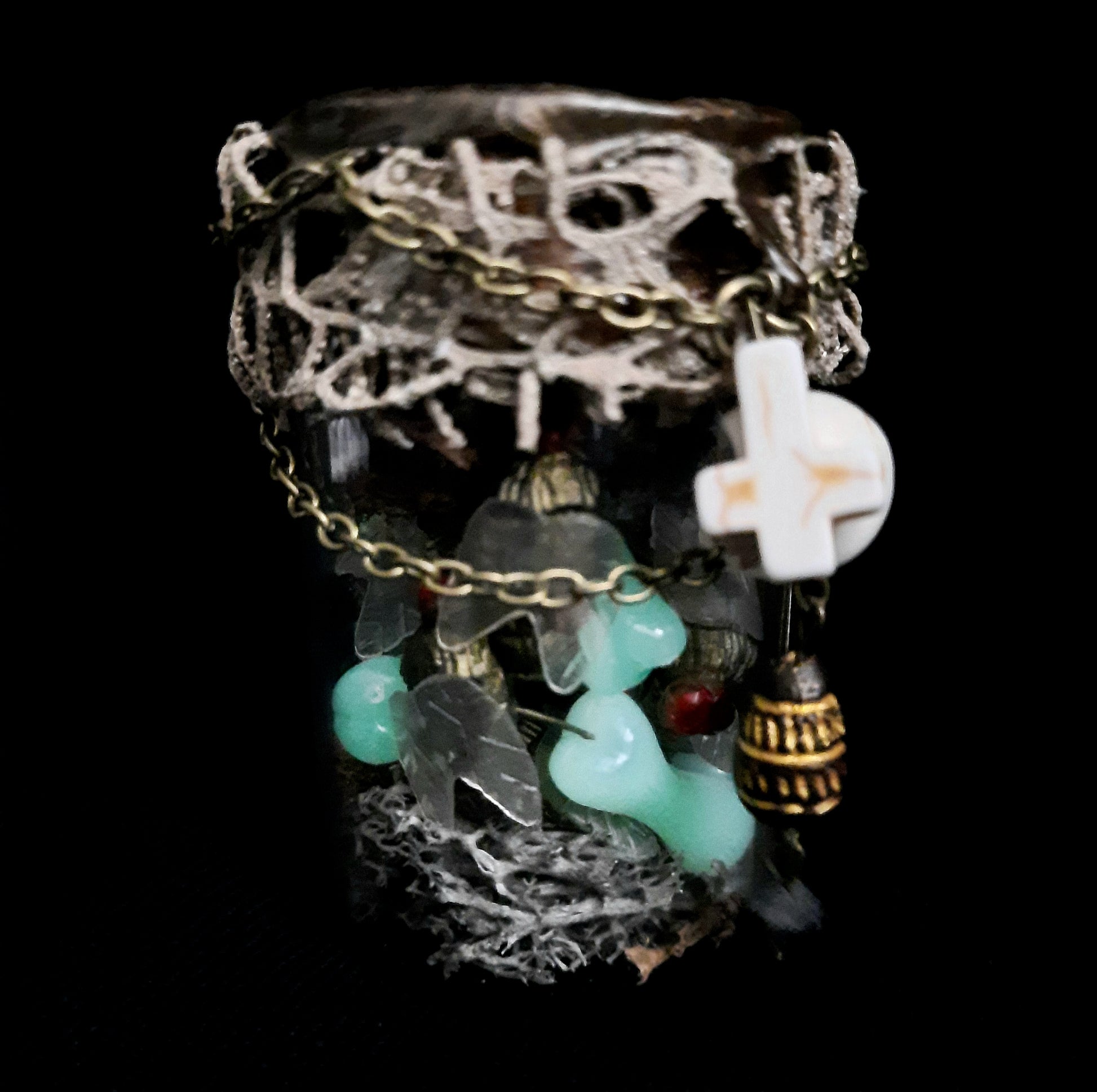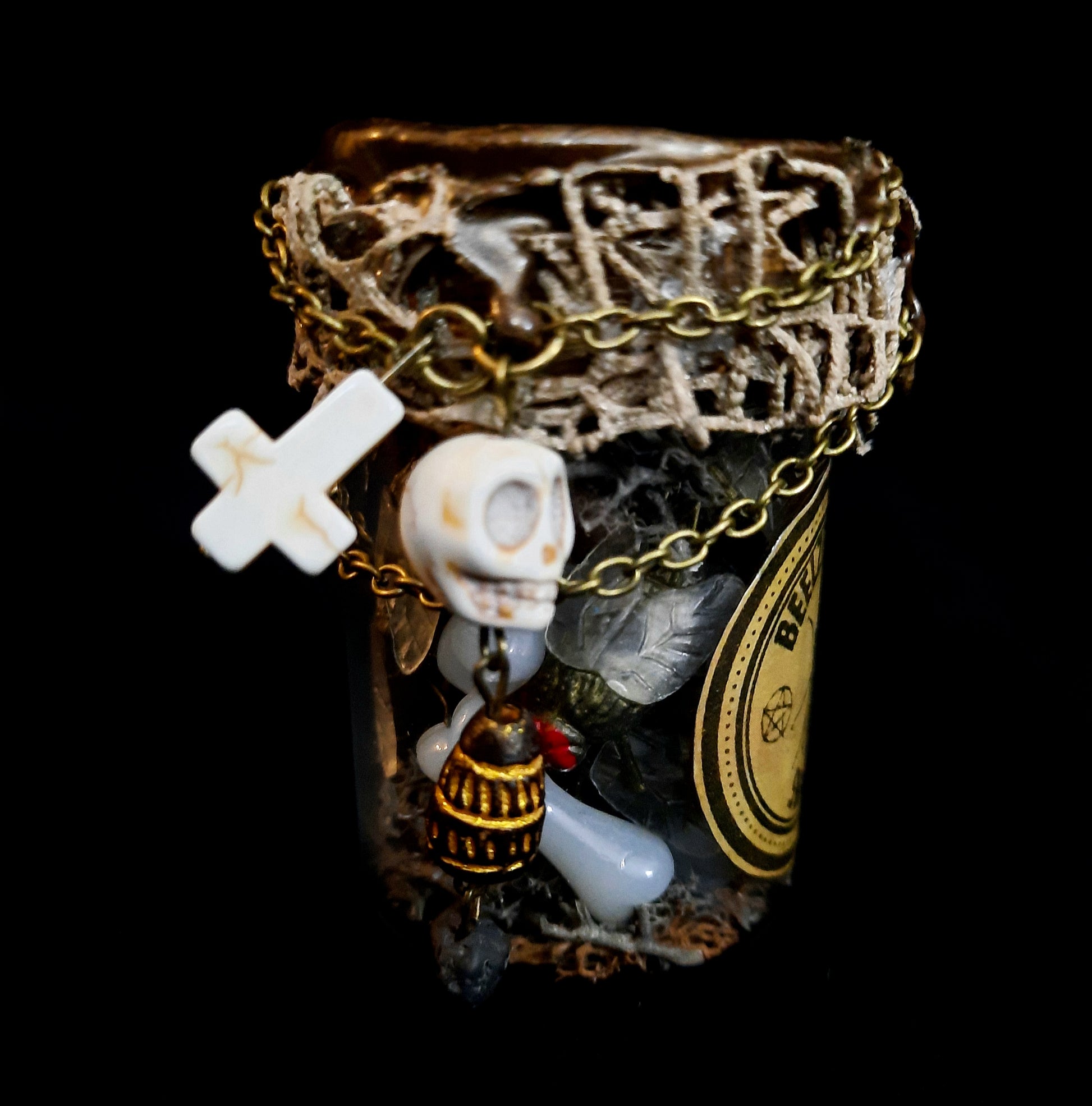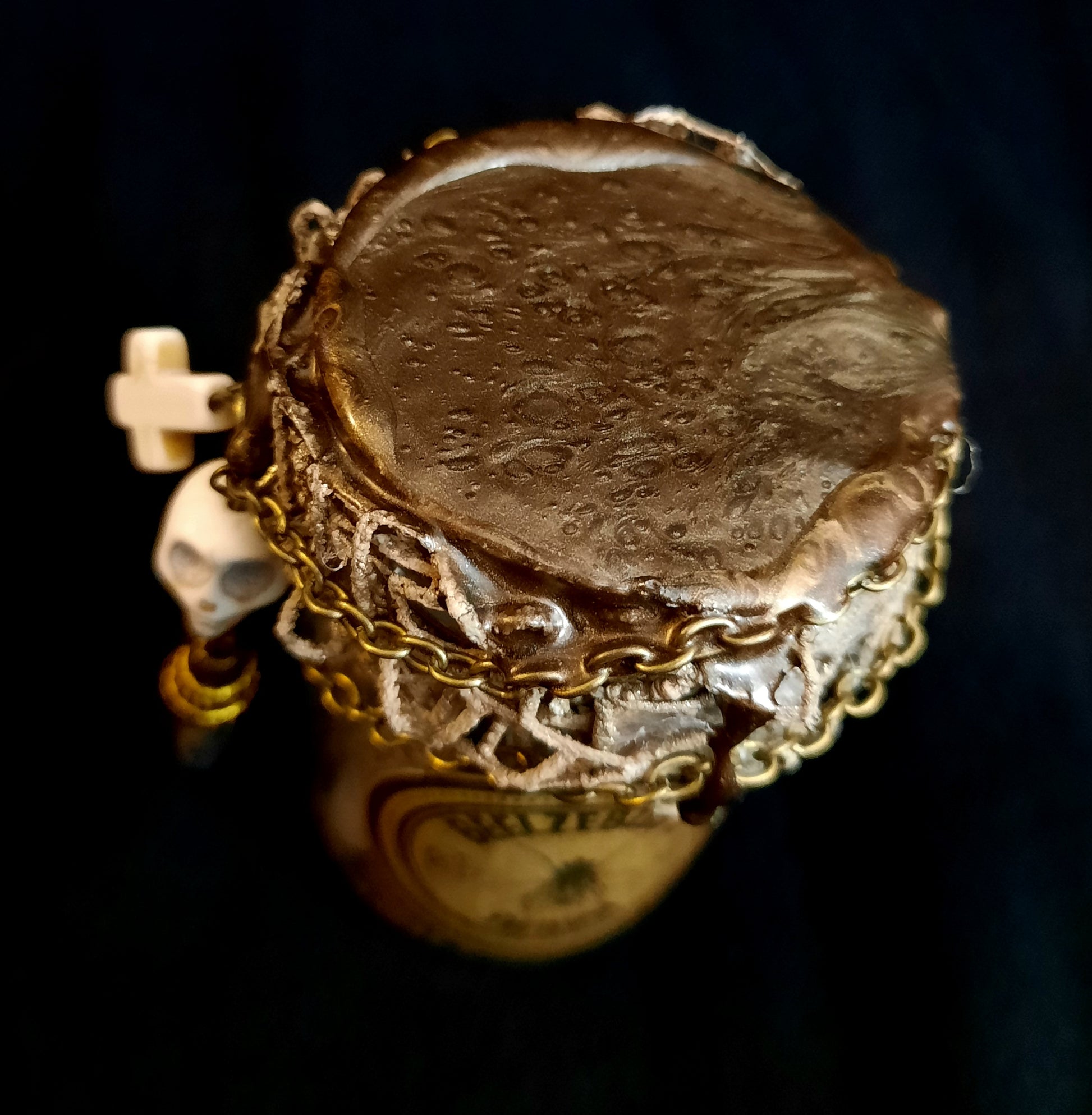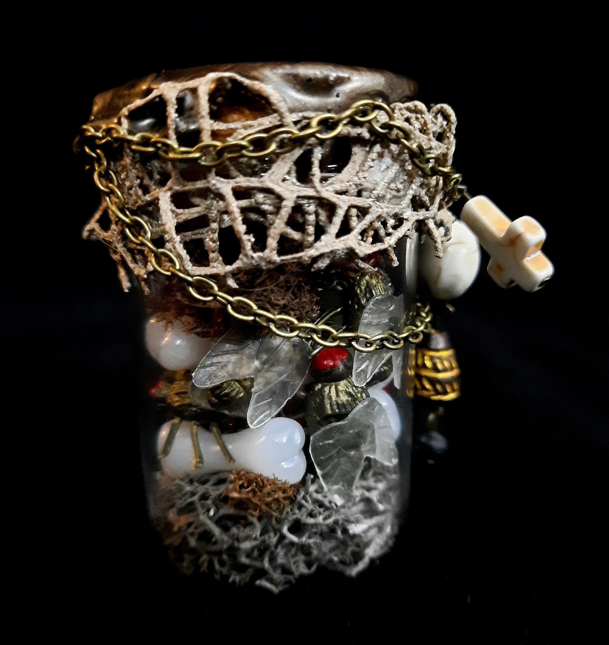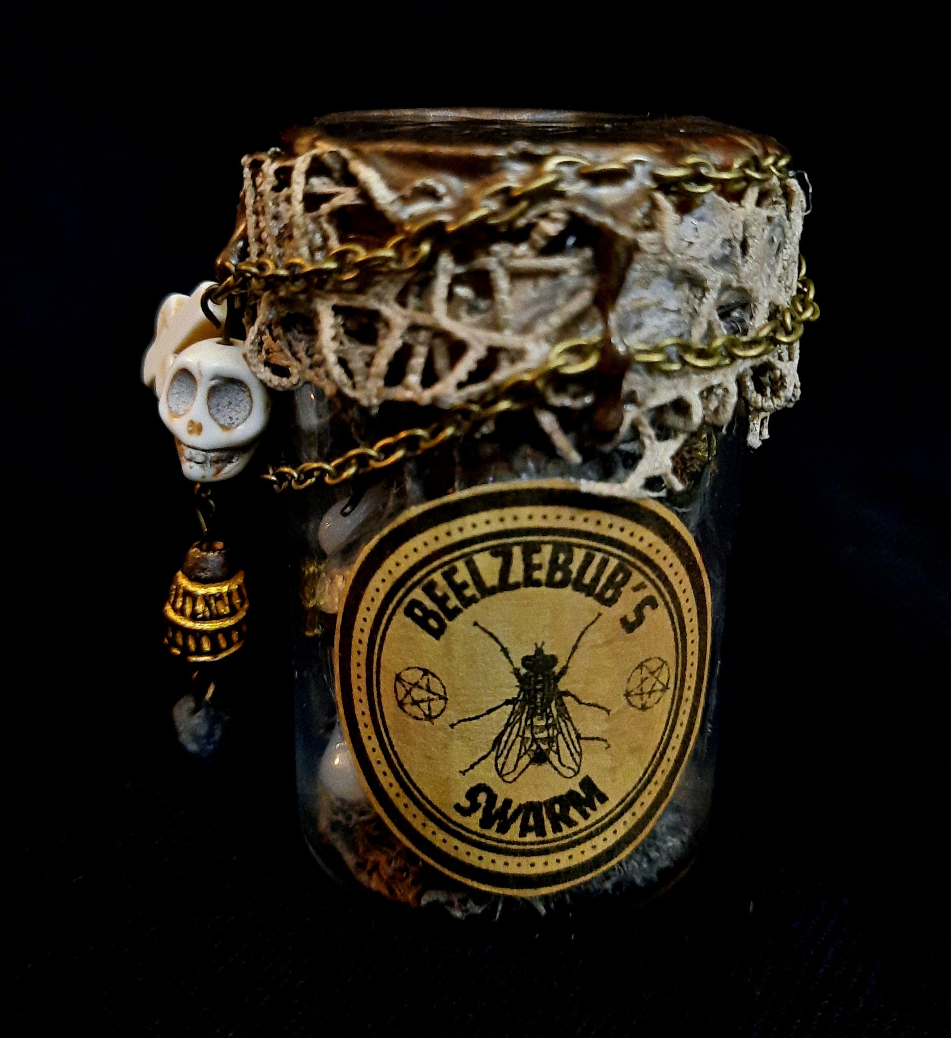 Beelzebub's Swarm Potion bottle is a glass bottle adorned with aged netting, bronze chain, white turquoise skull & cross beads, lava rock bead, and 1 black and gold clay bead. The bottle is filled with flies and glow in the dark bones. The bottle is sealed with a bonze and gold wax.