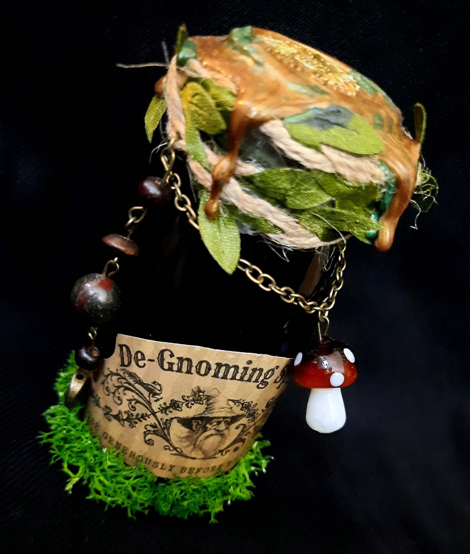 This bottle is adorned with green leaf twine, bronze chain, and a variety of beads, including wooden beads, dragons blood bead, metal embellished bead, and a glass mushroom charm. The bottle is sealed with a bronze and green wax with a flower stamp. The bottom of the bottle is covered in green moss.
