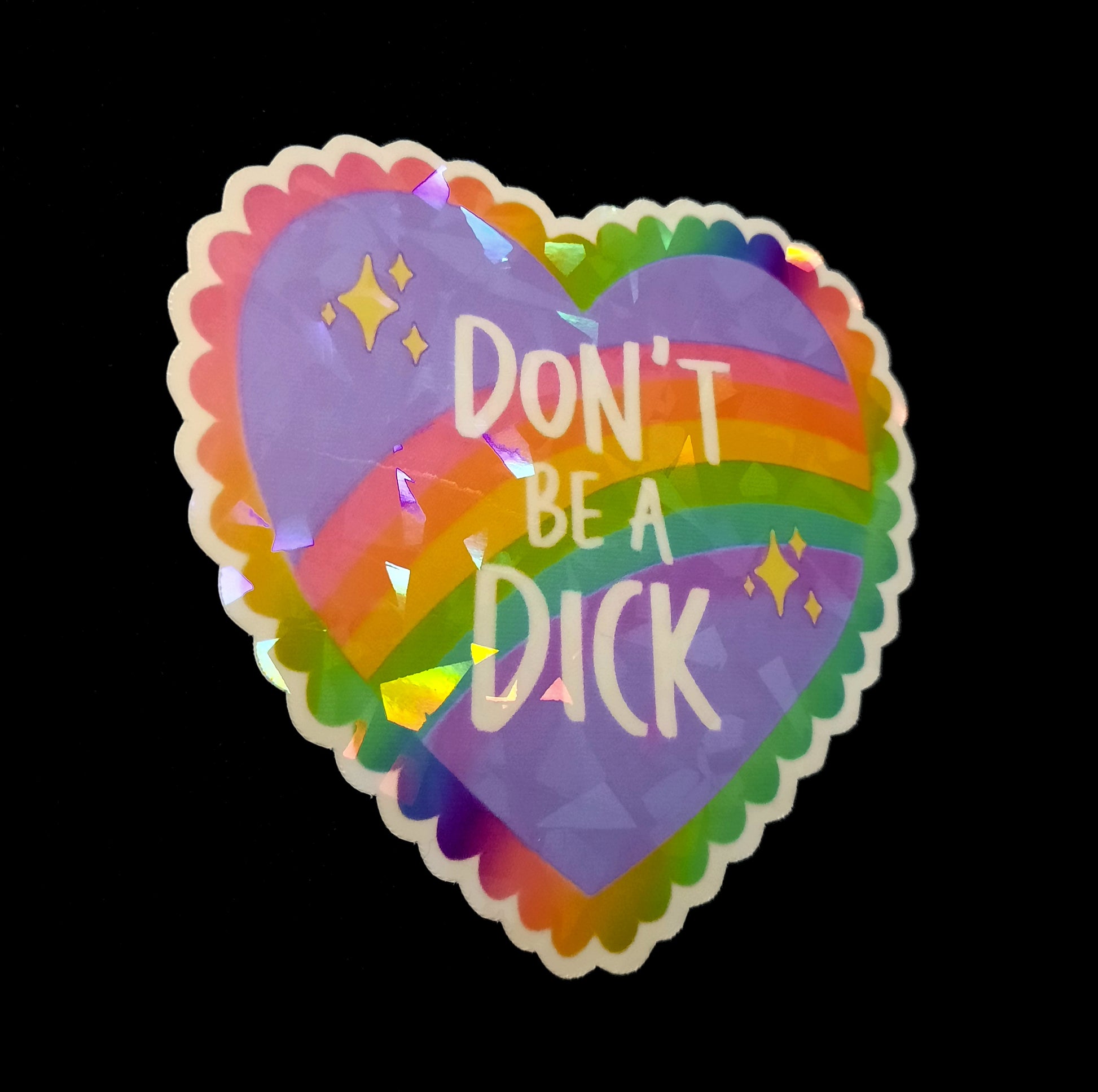 Don't be a dick rainbow heart sticker with holographic laminate.