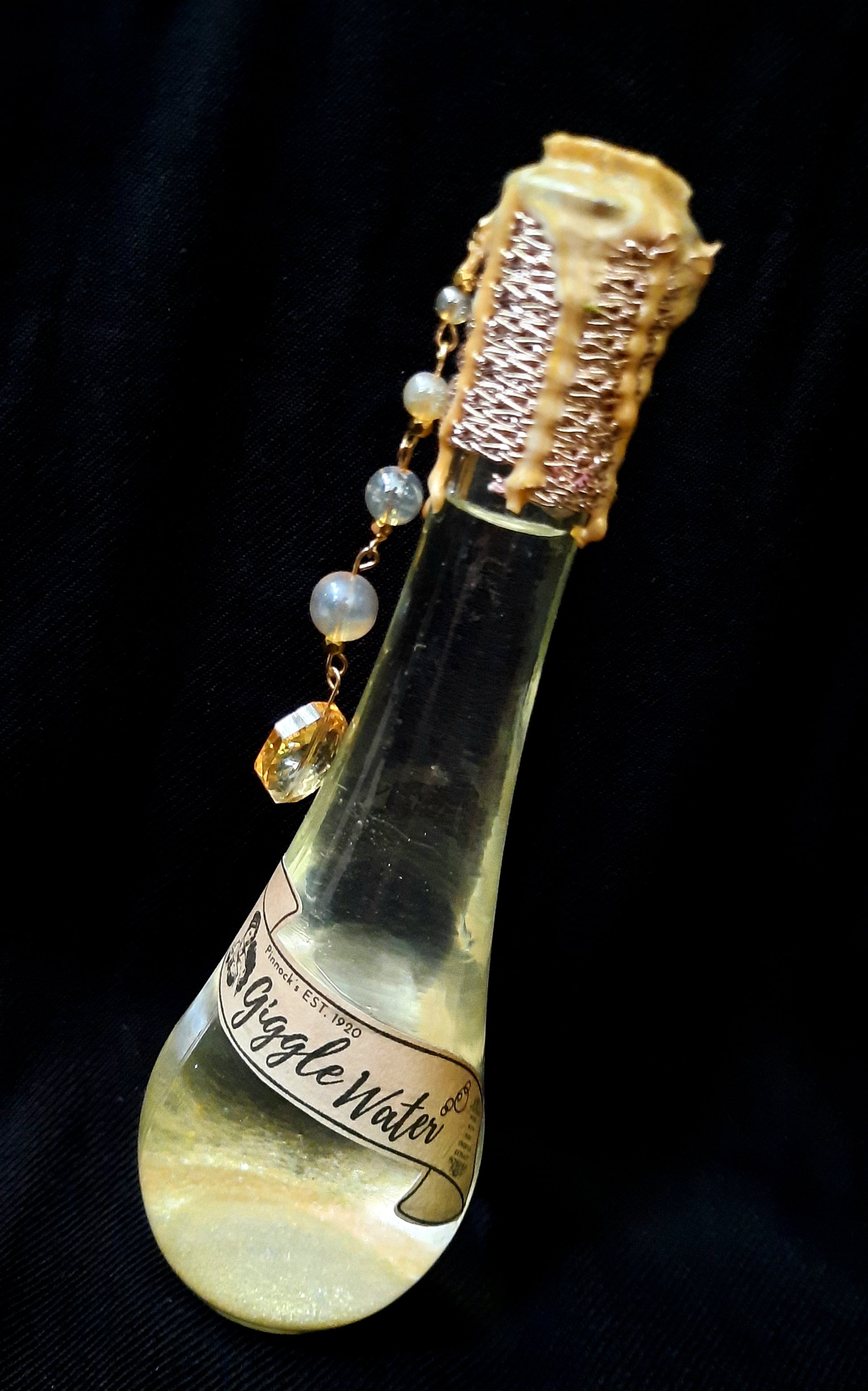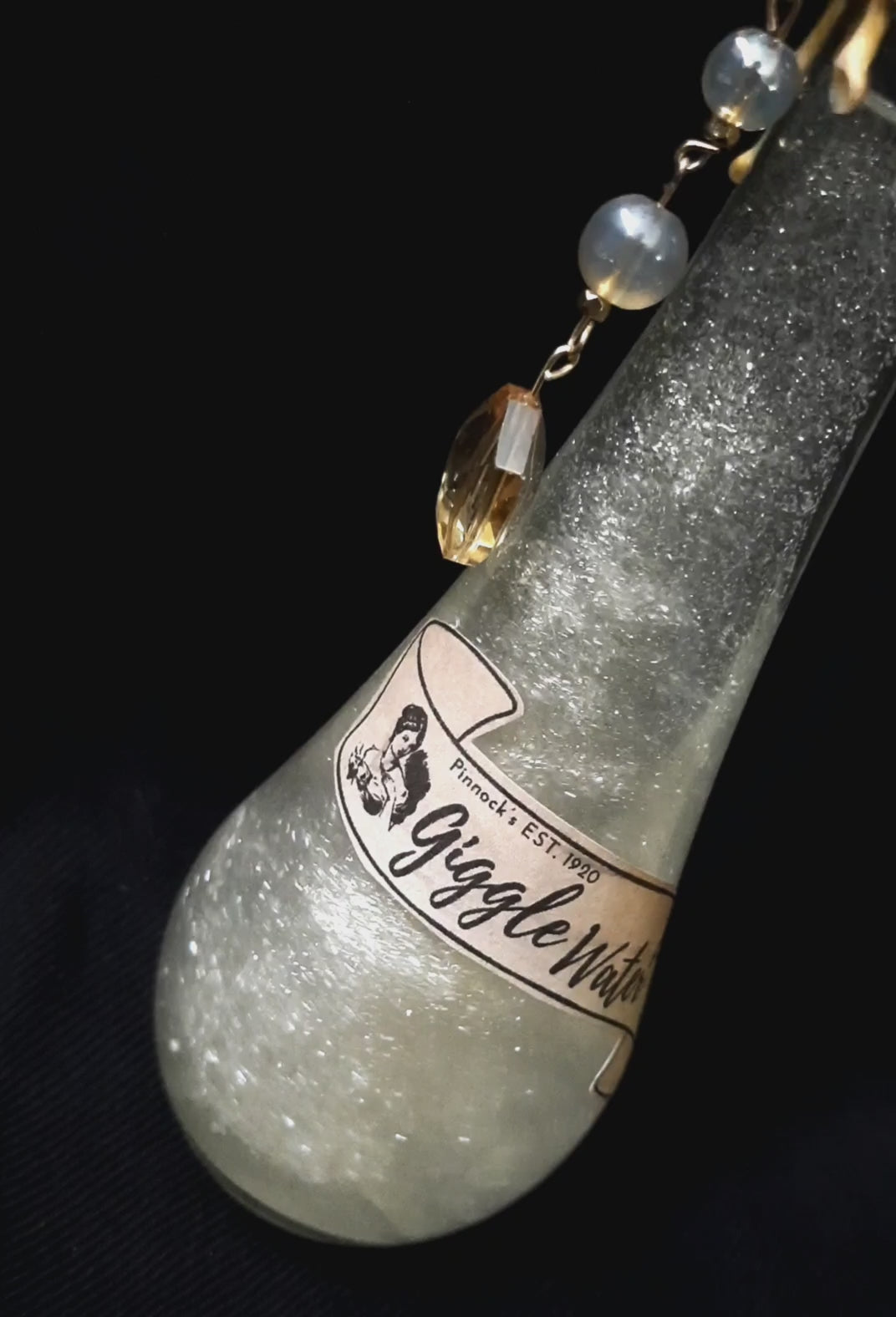 Giggle Water Potion Bottle is a glass potion bottle filled will clear potion. Once shaken it turns to a beautiful glitter. All shimmer will settle back down to the bottom of the bottle in about 10 minutes, until shaken again. This bottle is adorned with rose gold ribbon, gold chain, golden pearl glass beads, and a peach crystal bead. The bottle is sealed with white and gold wax, with a key stamp.