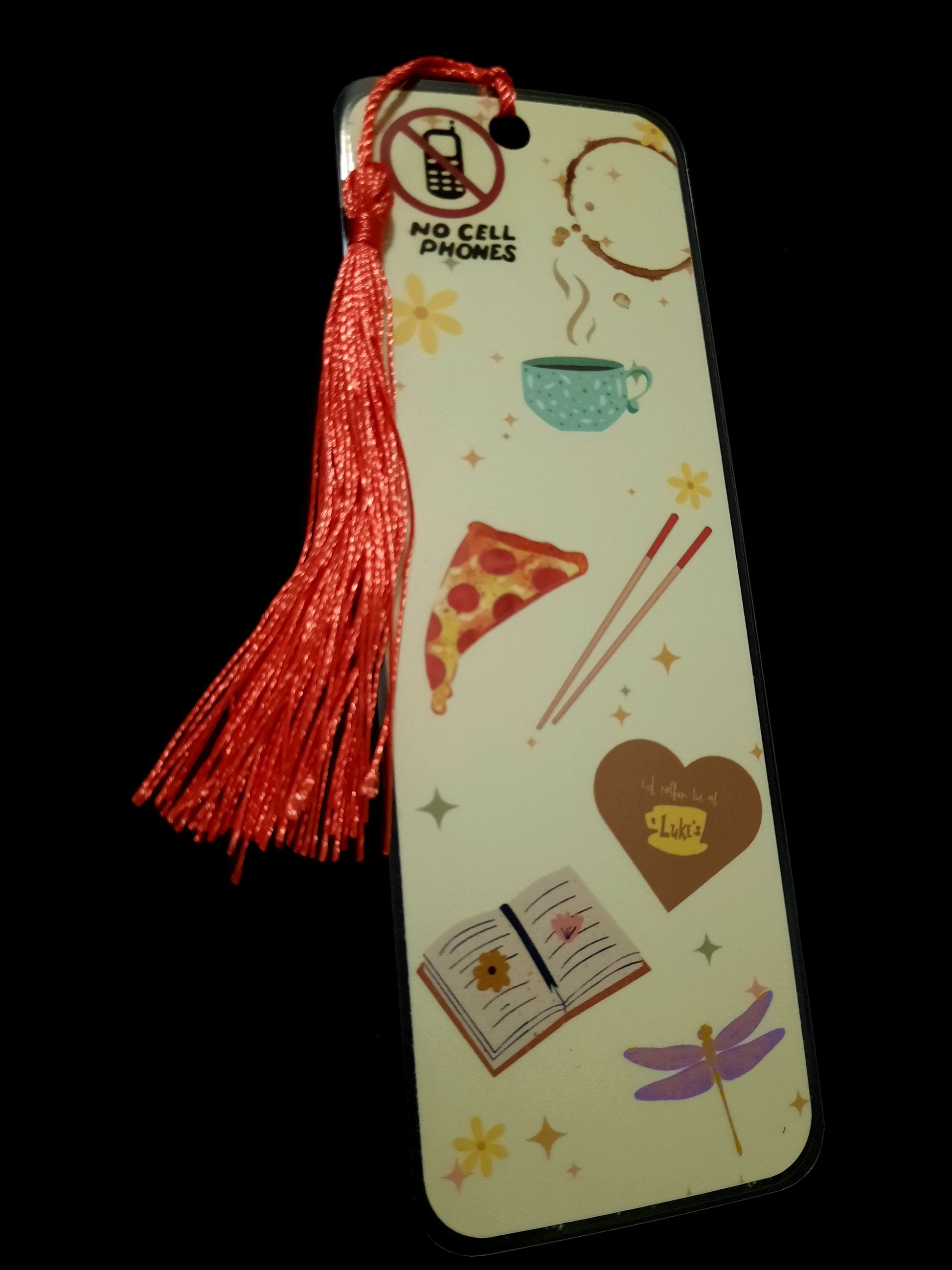 Gilmore Girls Aesthetic bookmark, featuring iconic bits from the hit show Gilmore Girls. Comes with a Salmon colored tassel.