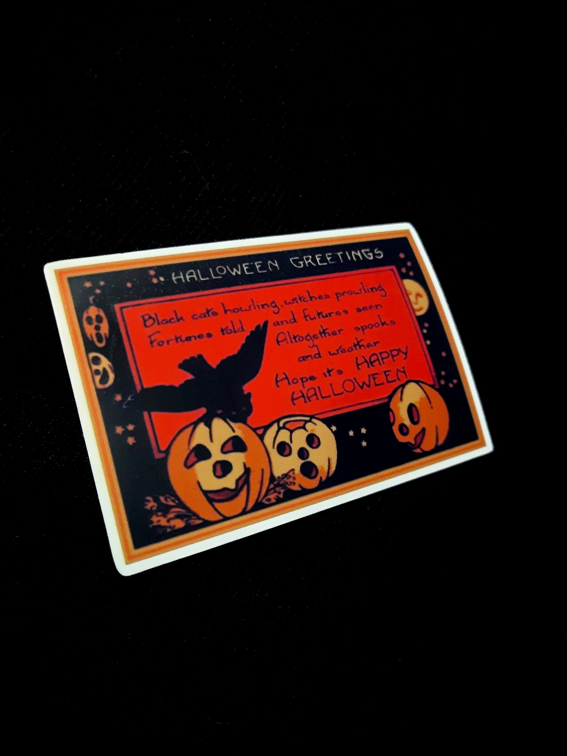 A classic Halloween charm! This vintage greeting card sticker captures black cats howling, witches prowling, and fortunes foretold-spooky, magical, and full of Halloween cheer. Perfect for decorating your planner, journal, or laptop with a touch of nostalgic spookiness.
