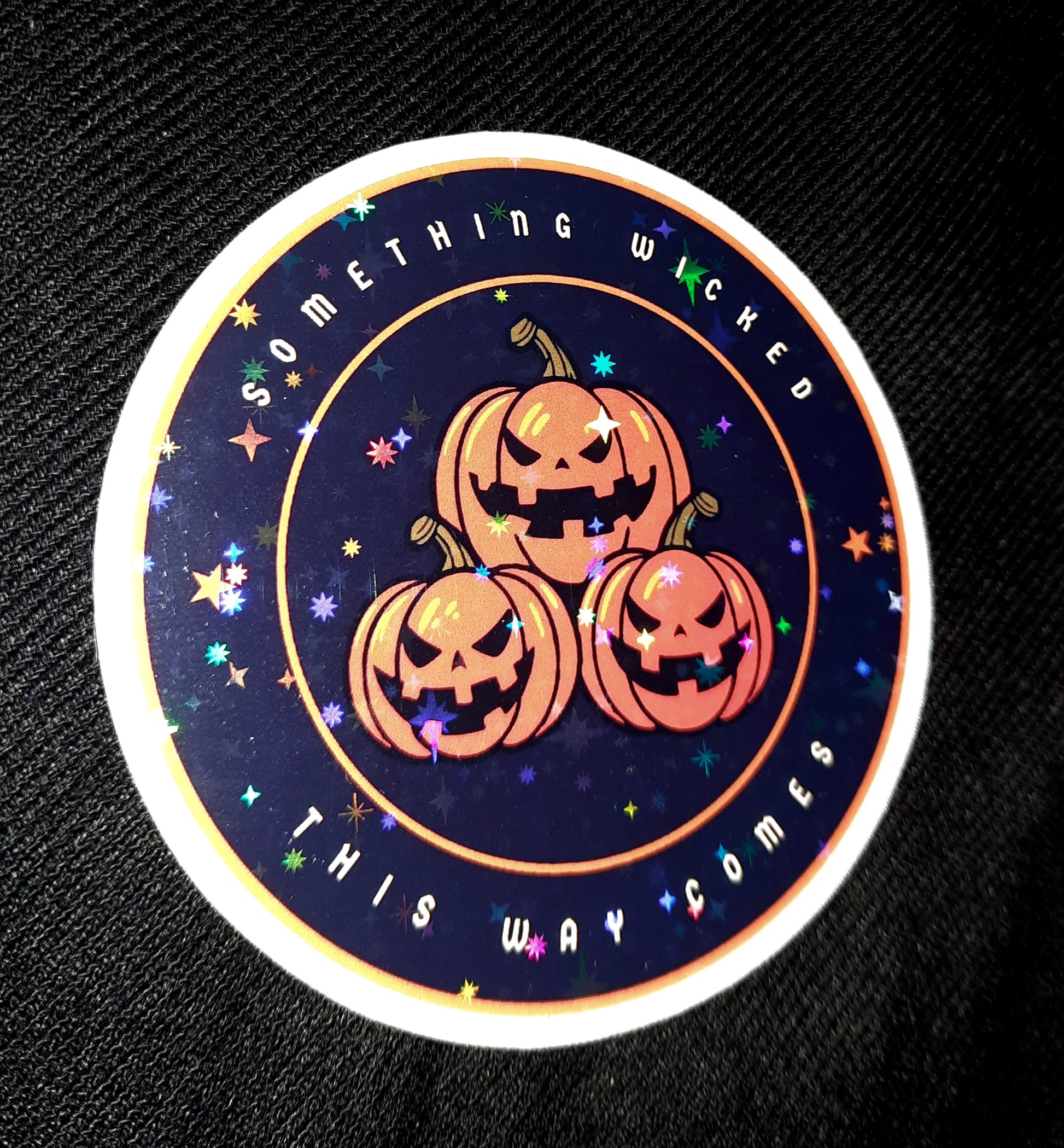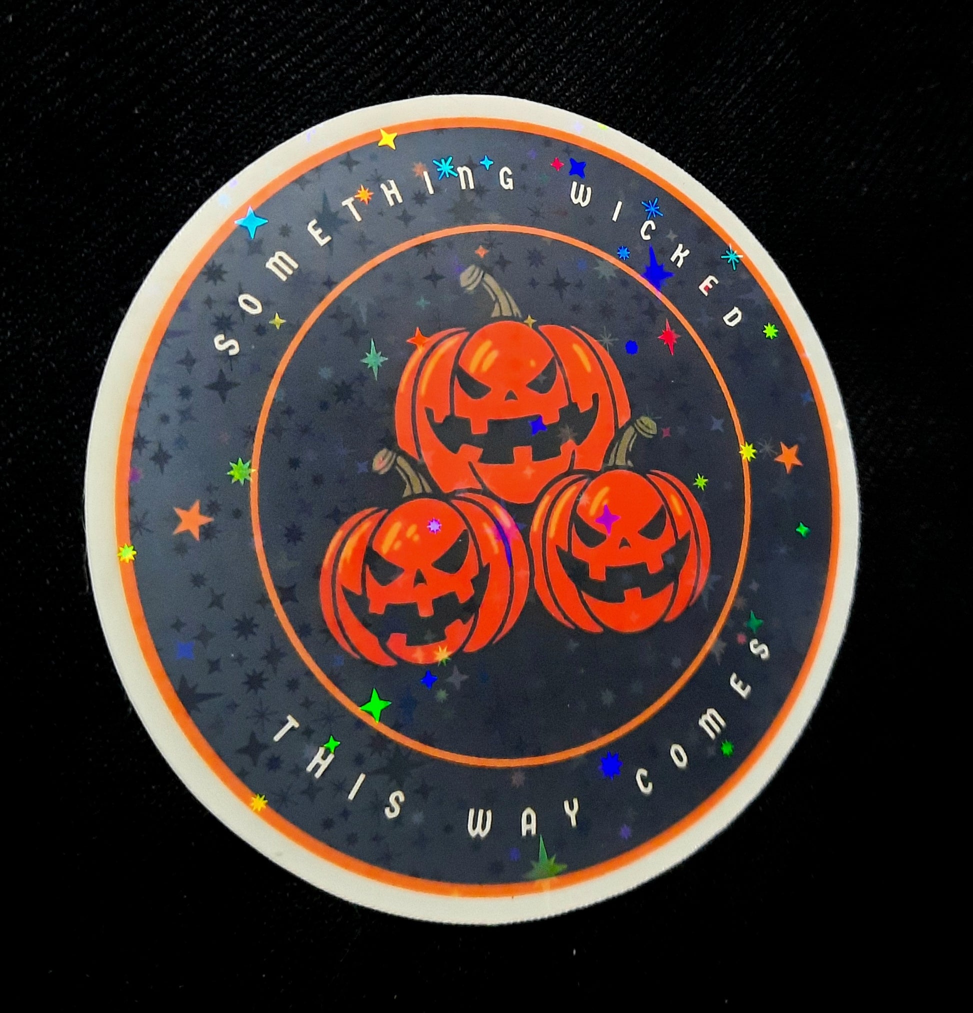 Calling all Halloween fans! Something Wicked This Way Comes Jacko lantern holographic sticker. 2.8" diameter. Holographic laminate and water resistant.