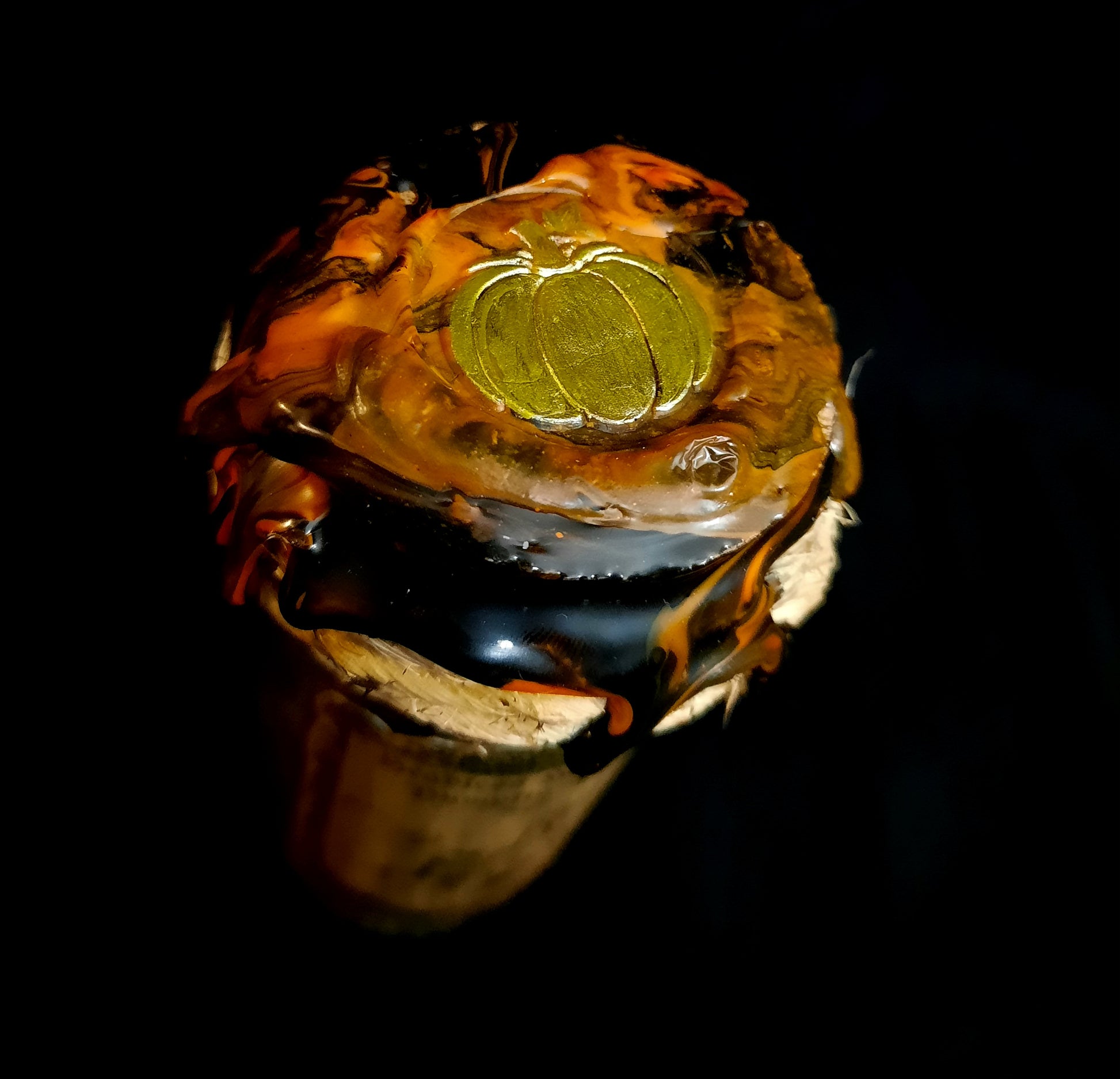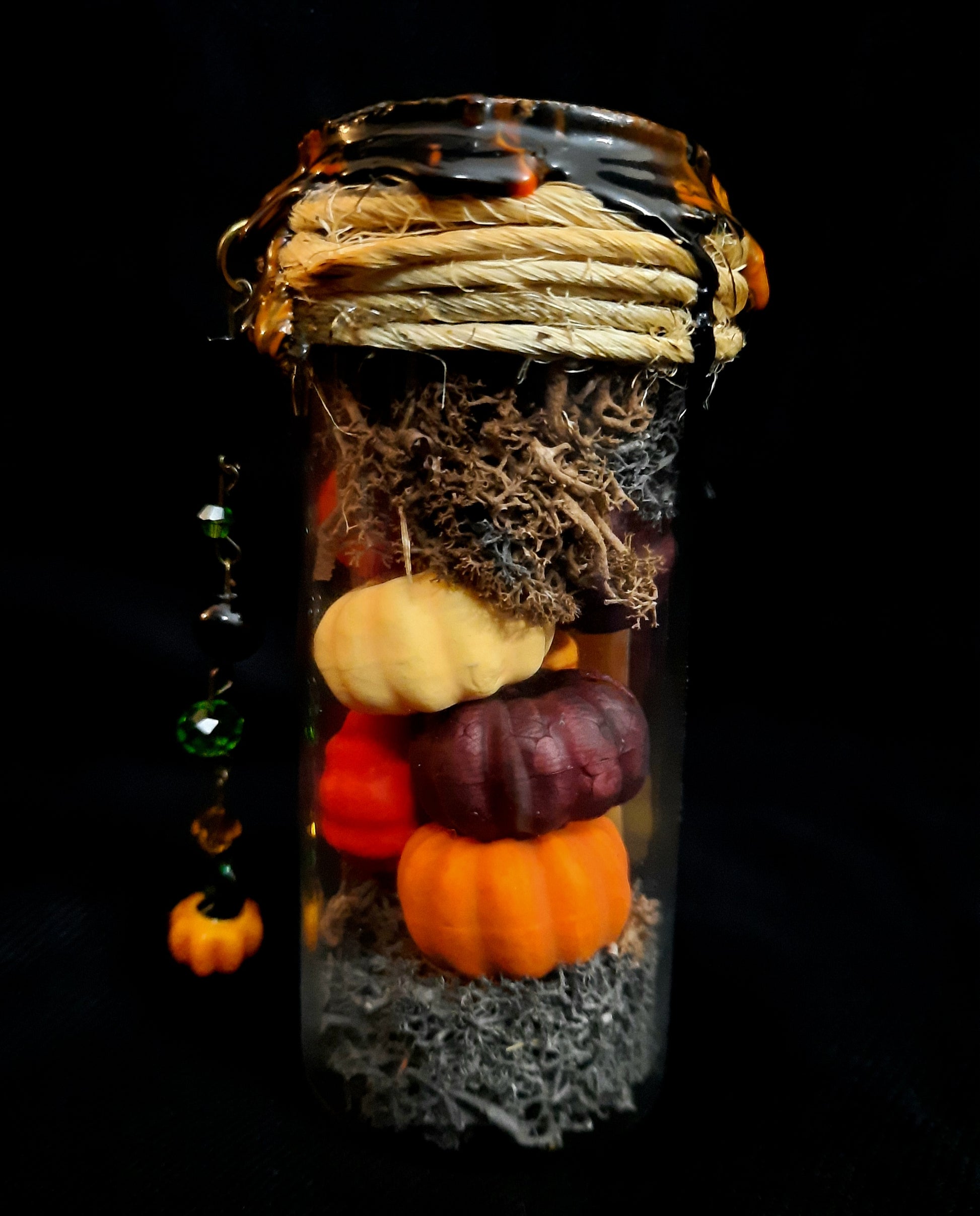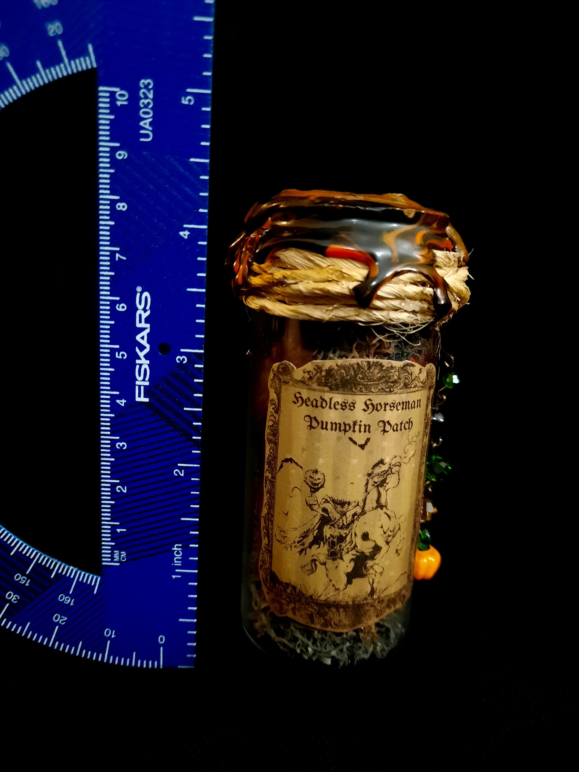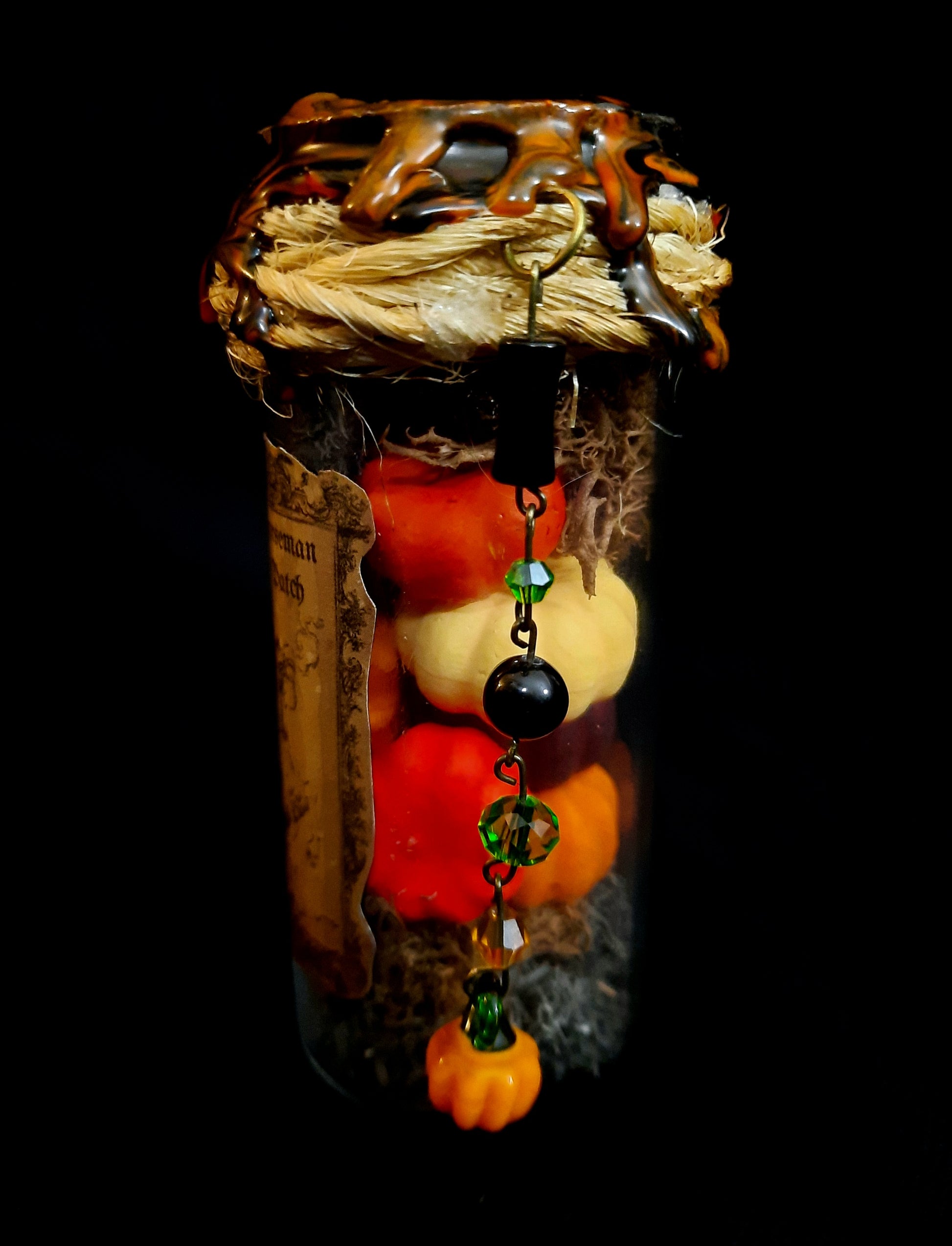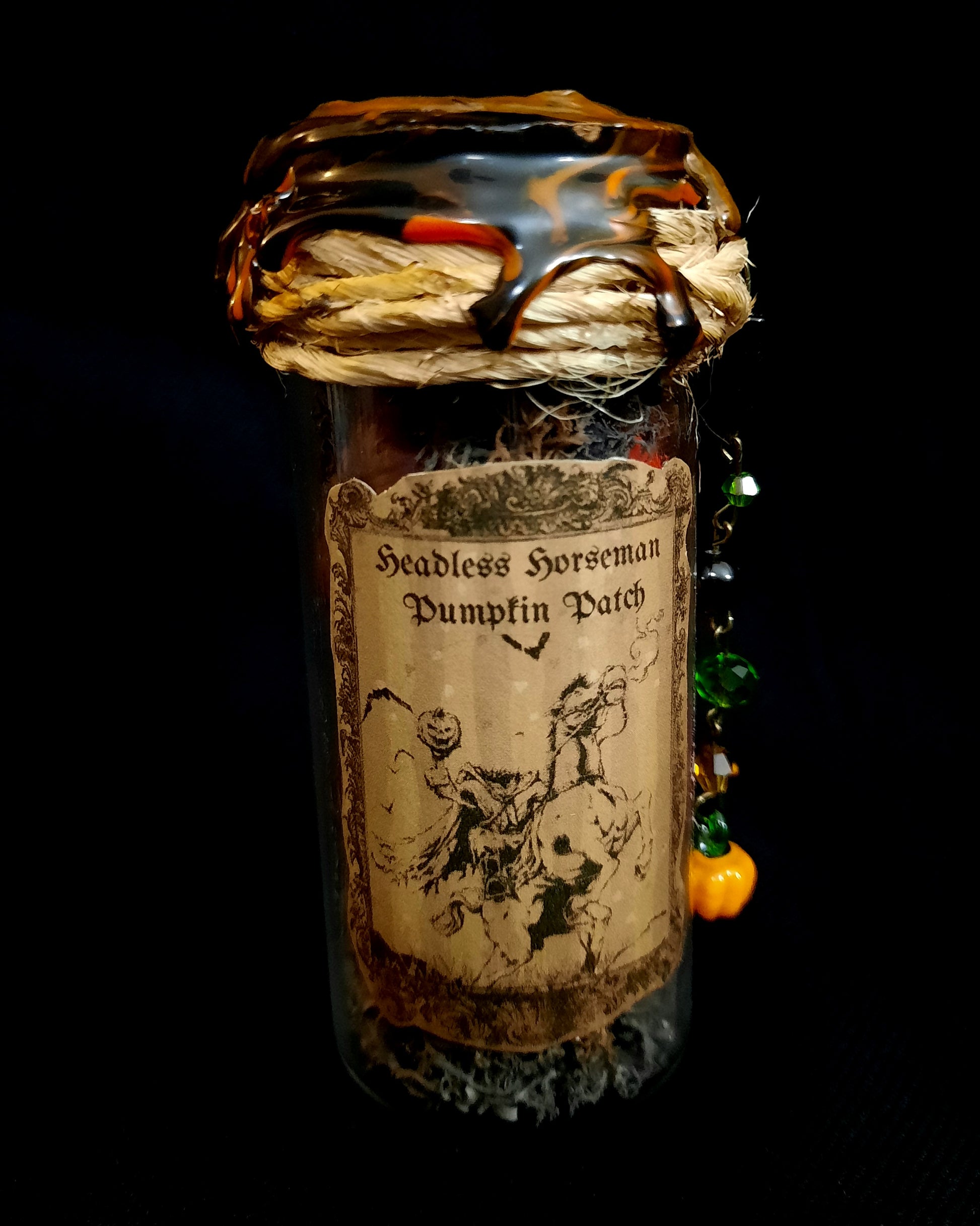 Headless Horseman's Pumpkin Patch Potion bottle is a glass bottle adorned with burned twine, a variety of green and orange glass beads, black & silver onyx beads, and 1 glass pumpkin charm. The bottle is filled with black and brown moss, and a variety of colored pumpkins. The bottle is sealed with black and orange wax, and a gold pumpkin stamp.