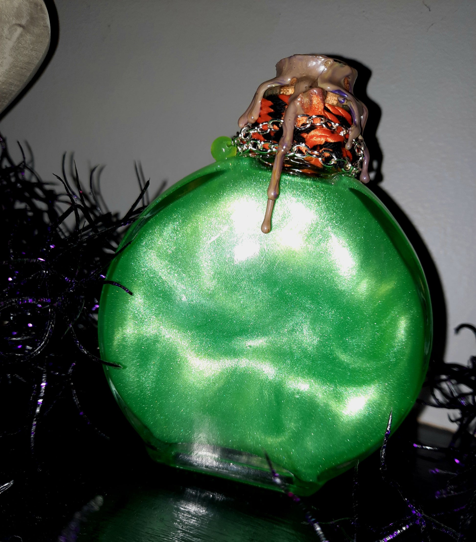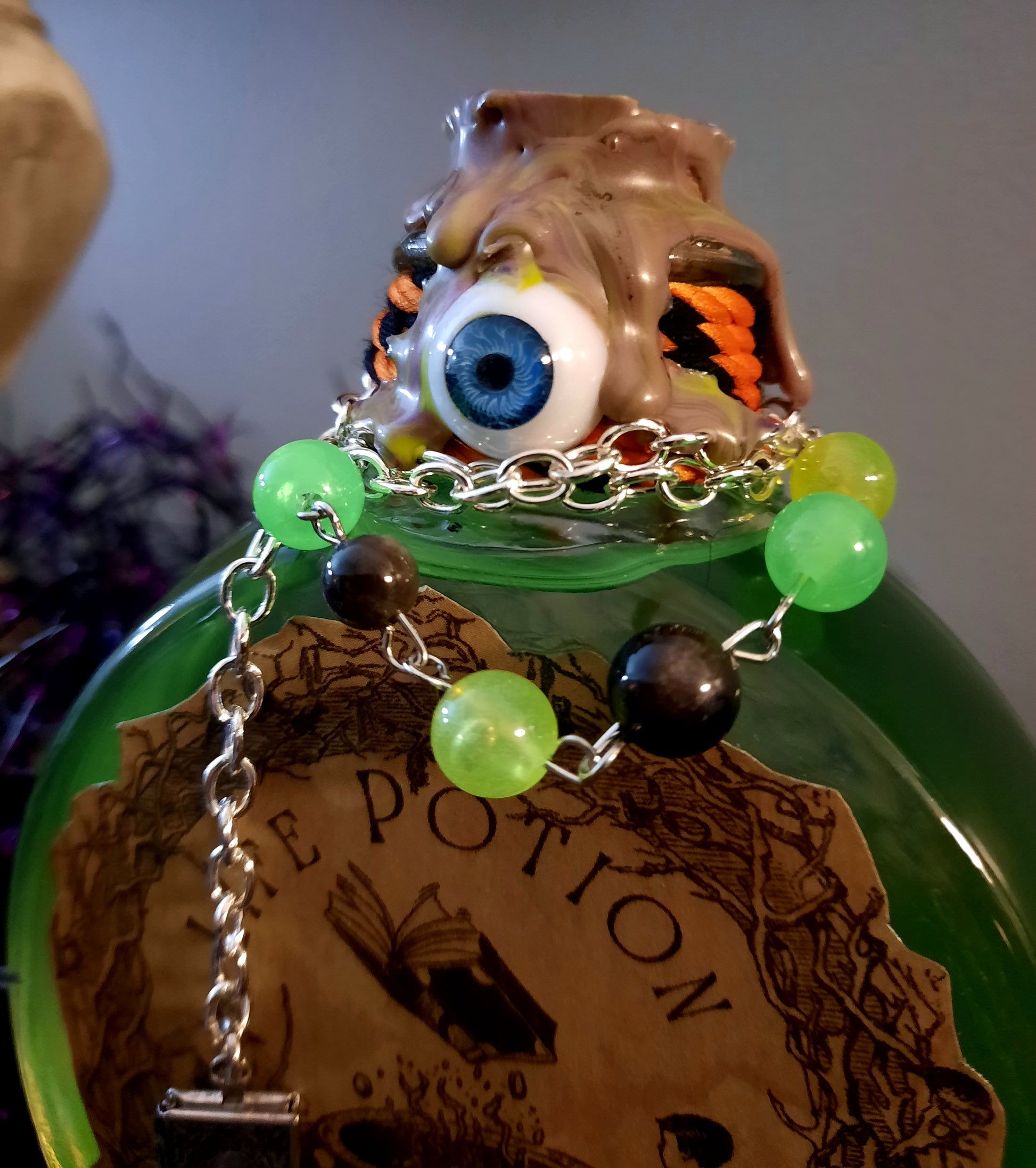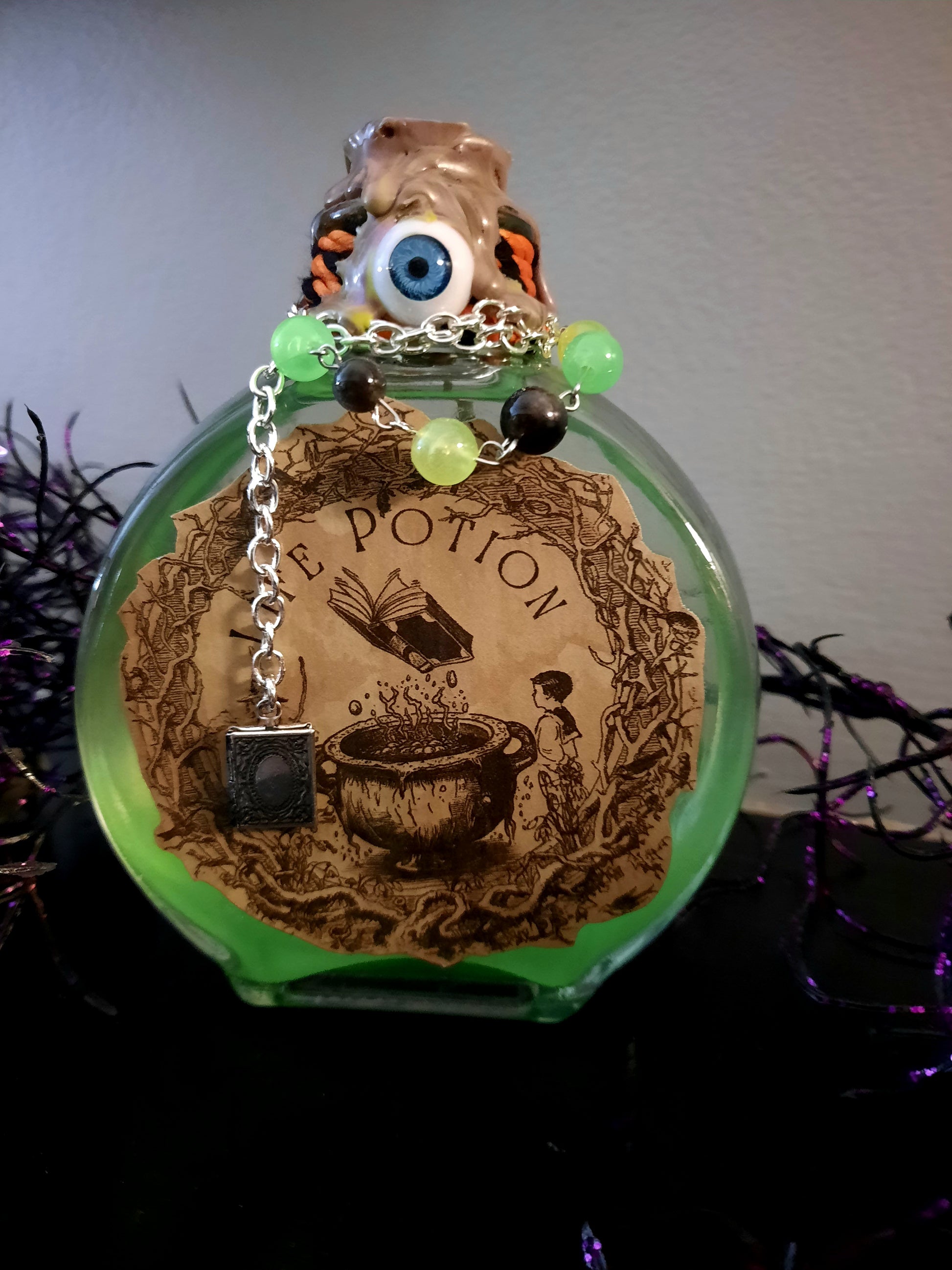 This glass bottle is adorned with black and orange cord, black glass beads, green and yellow glow in the dark beads, a silver book locket, and an iconic eye, just like book himself. Purple and green wax with a graveyard stamp. All potion bottles are handmade. This bottle contains a clear liquid, that swirls into a neon green shimmer once shaken. Shimmer will settle back to the bottle in about 30 minutes, until shaken again.
