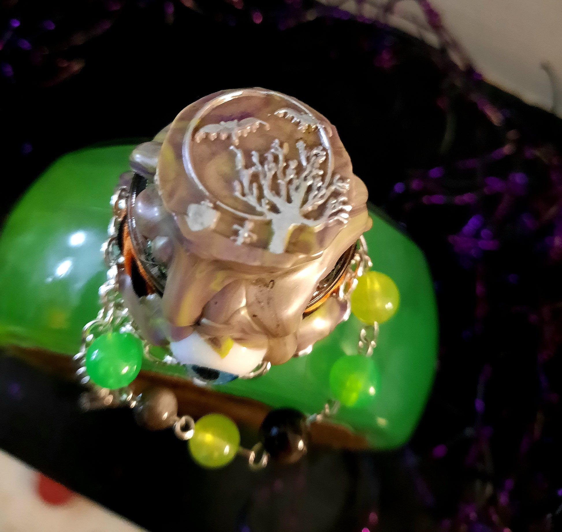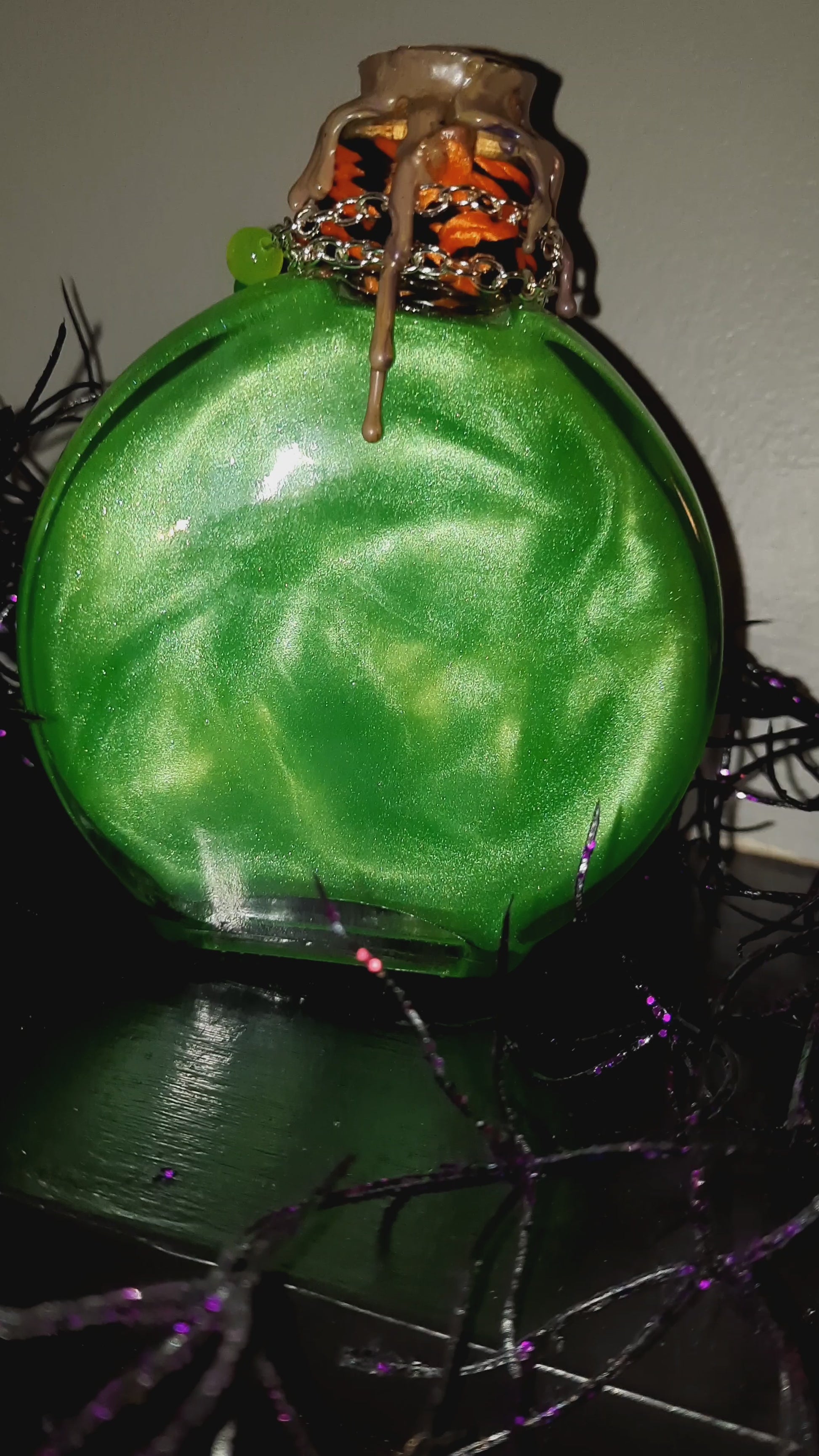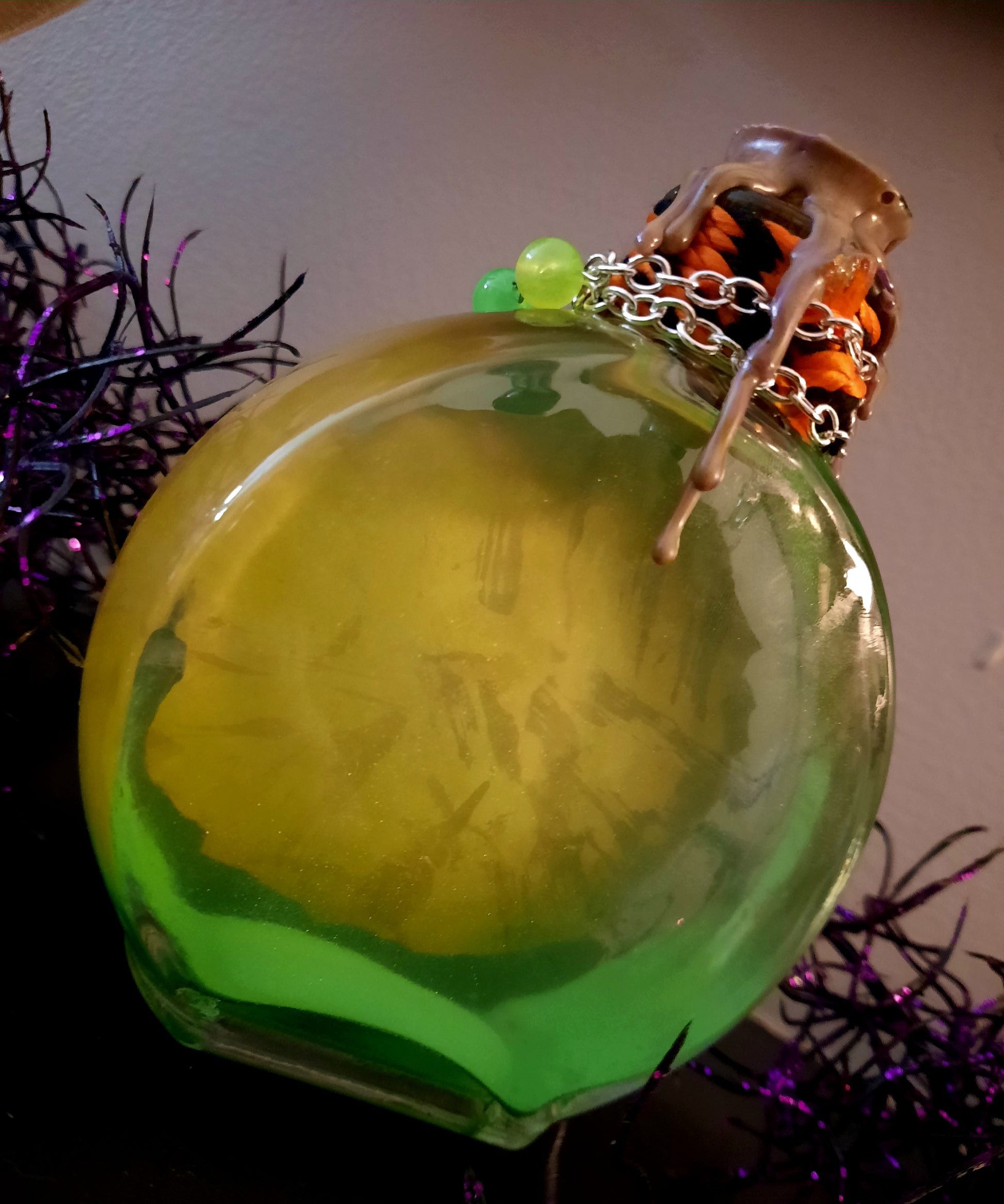 This glass bottle is adorned with black and orange cord, black glass beads, green and yellow glow in the dark beads, a silver book locket, and an iconic eye, just like book himself. Purple and green wax with a graveyard stamp. All potion bottles are handmade. This bottle contains a clear liquid, that swirls into a neon green shimmer once shaken. Shimmer will settle back to the bottle in about 30 minutes, until shaken again.