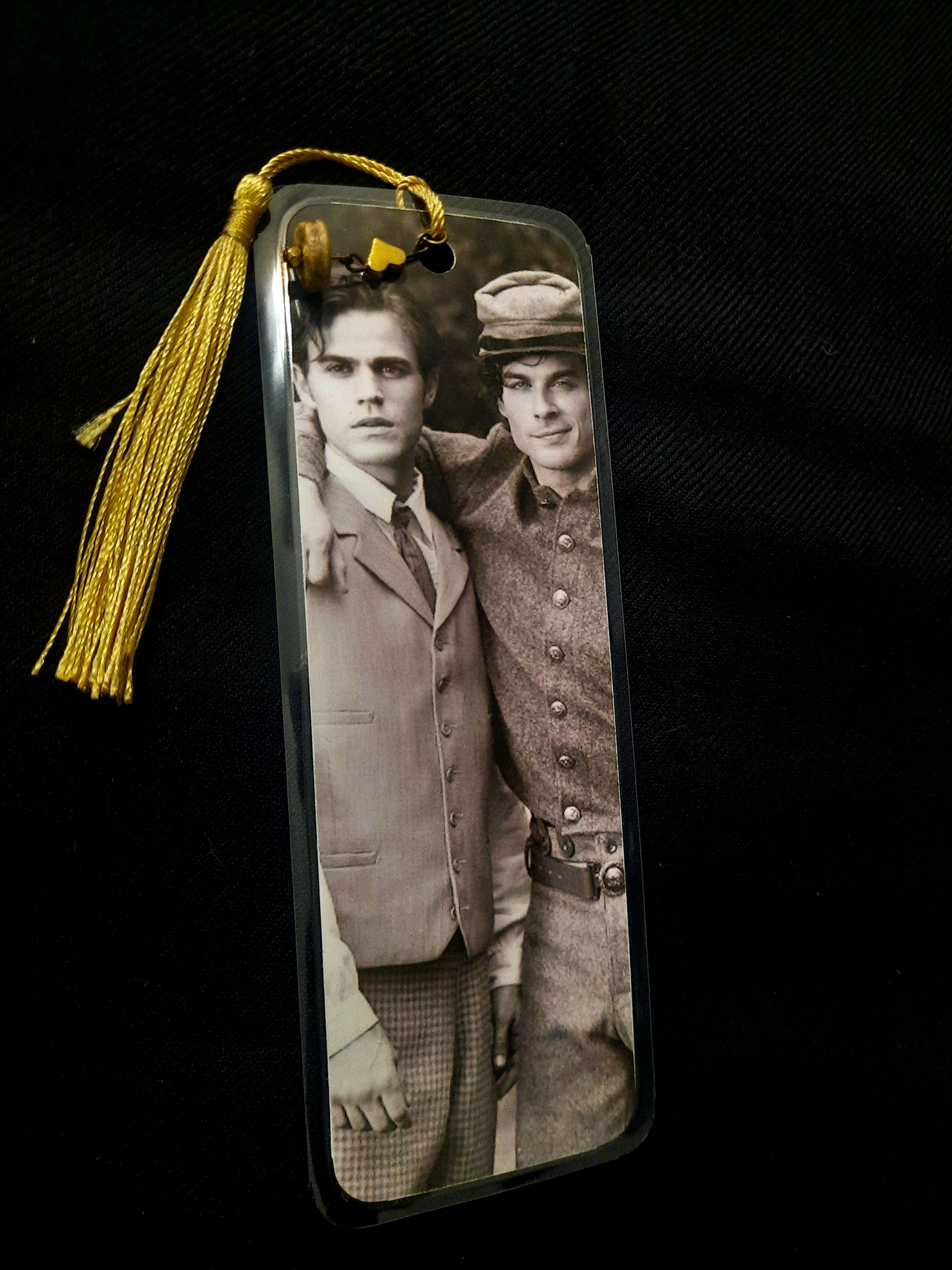 Step back into 1864 with the Salvatore brothers-timeless, tragic, and unforgettable. This black and white laminated bookmark captures the haunting charm of their past, finished with a golden heart and an aged wooden bead-symbolizing love, loyalty, and the weight of eternity. A perfect keepsake for every Vampire Diaries devotee or dark romance reader who believes some stories never die.