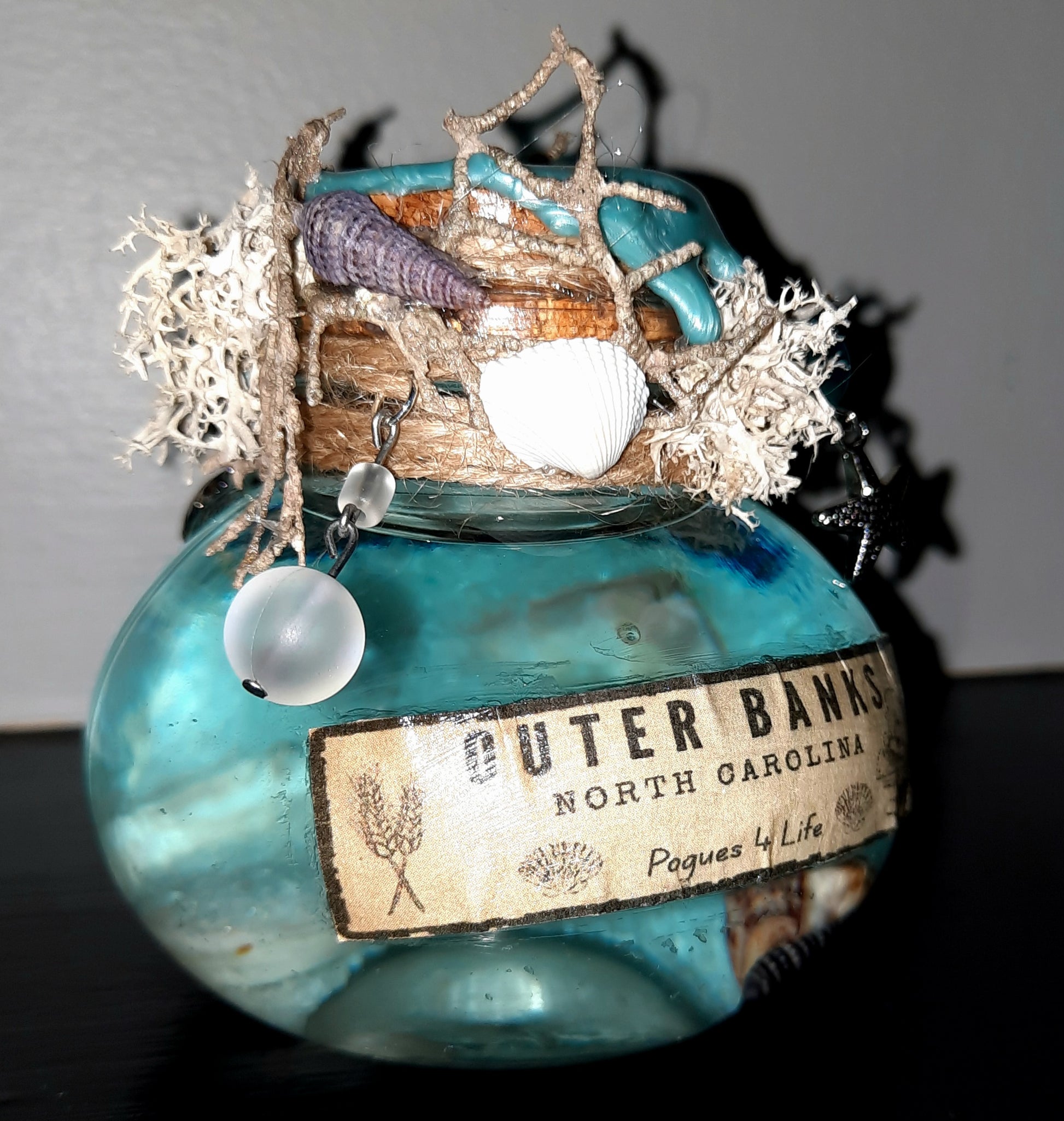 Capture the salt-kissed magic of the Outer Banks with this handcrafted glass keepsake. Inside, gentle waves of light-blue shimmer wash over real sand and seashells - a miniature shoreline sealed in glass. Wrapped in coastal netting and adorned with white moss, sea-glass beads, and delicate shell charms, every detail evokes sun-drenched days and moonlit tides.