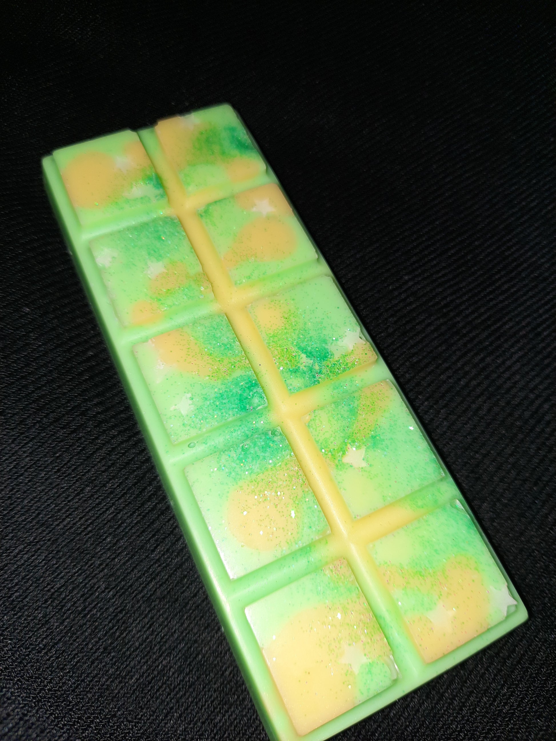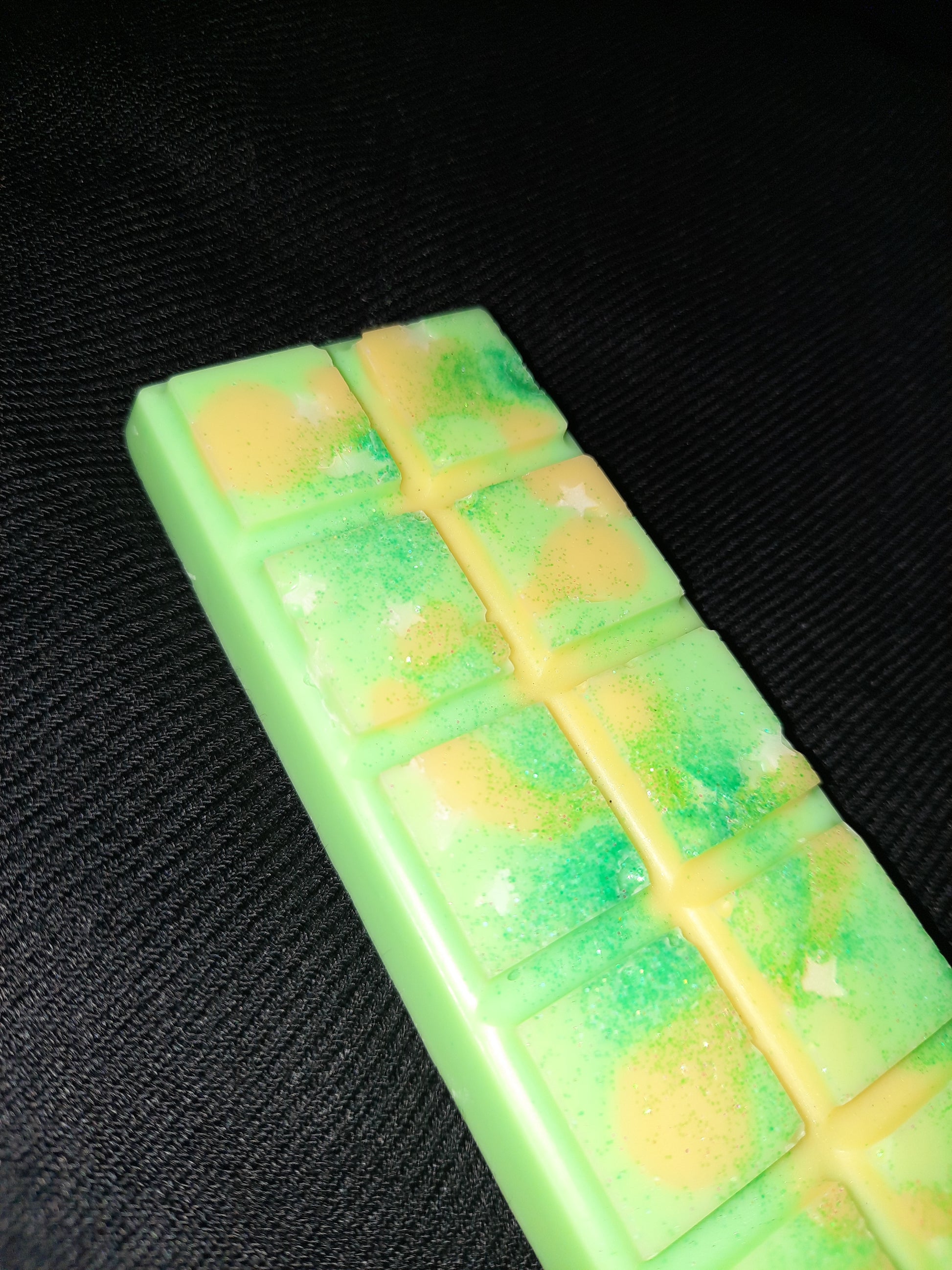 Didn’t even want to melt this gorgeous wax! it has glow in the dark stars and glitter. It smelled incredible in the package so I had to throw it in and let me tell you….. it smells even better in my home. It melted into neon swirls of witchy lime greens and the stars/glitter stayed on top, so they didn’t stick to the bottom of the warmer. It looks just as pretty melted. I use a low heat warmer for soy melts in general and with these, I can just keep reusing it for days and the scent lasts!