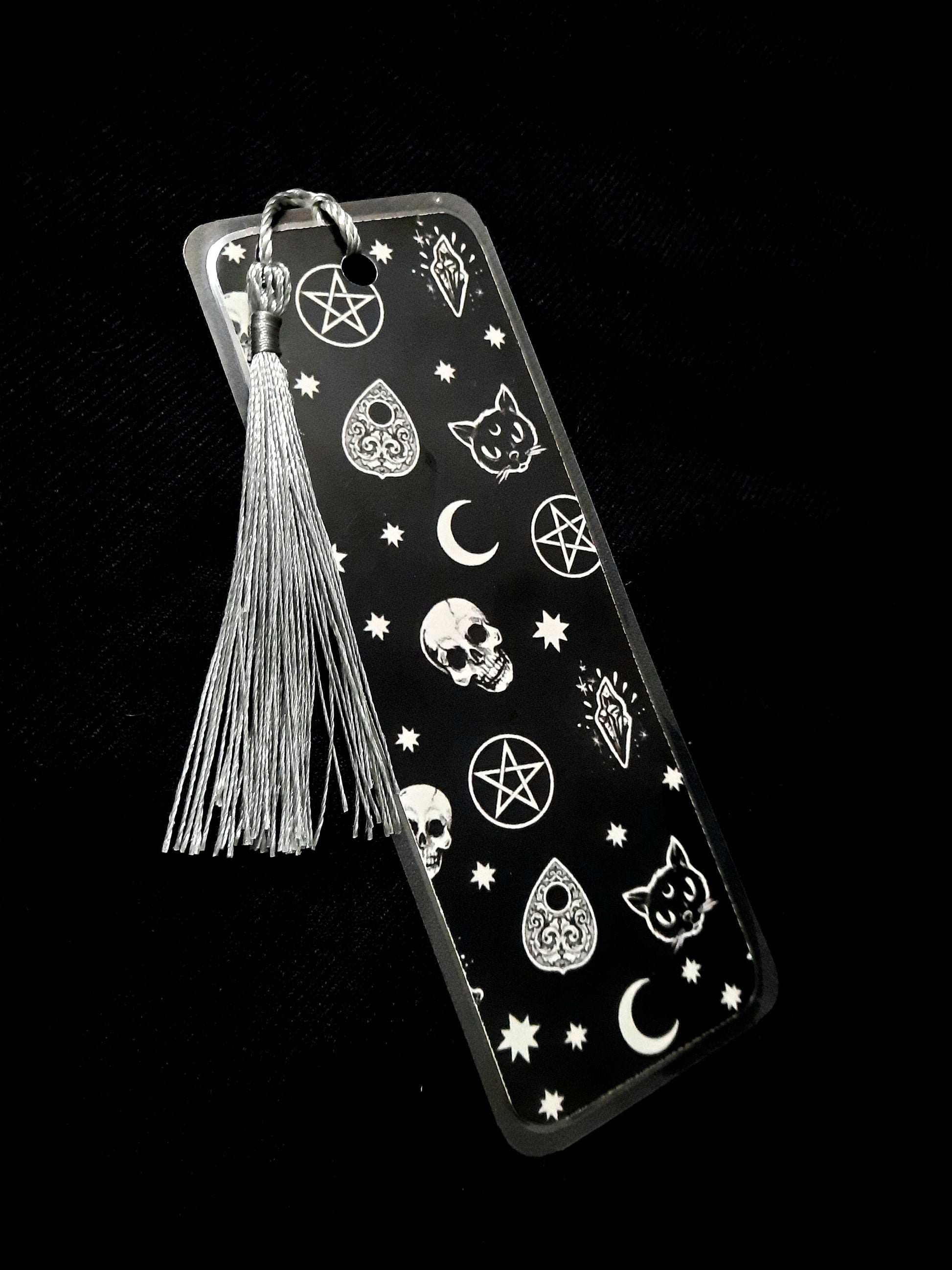 Step into the shadows with this witchy bookmark. Black ground adorned with white pentagrams, skulls, black cats, and mystical planchettes-perfect for your magical reading sessions. Keep your place with a touch of mystery and enchantment and let every page feel spellbound.