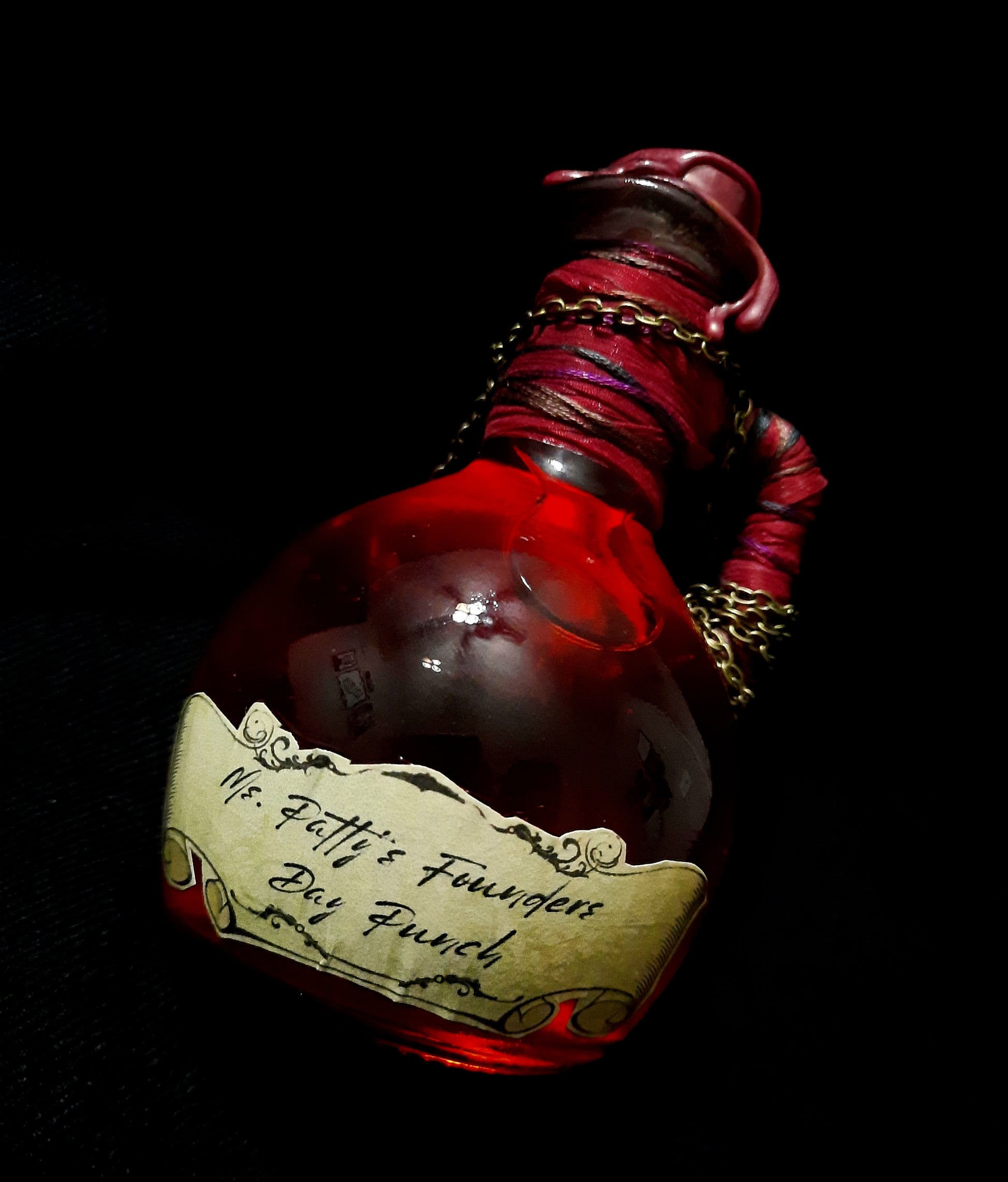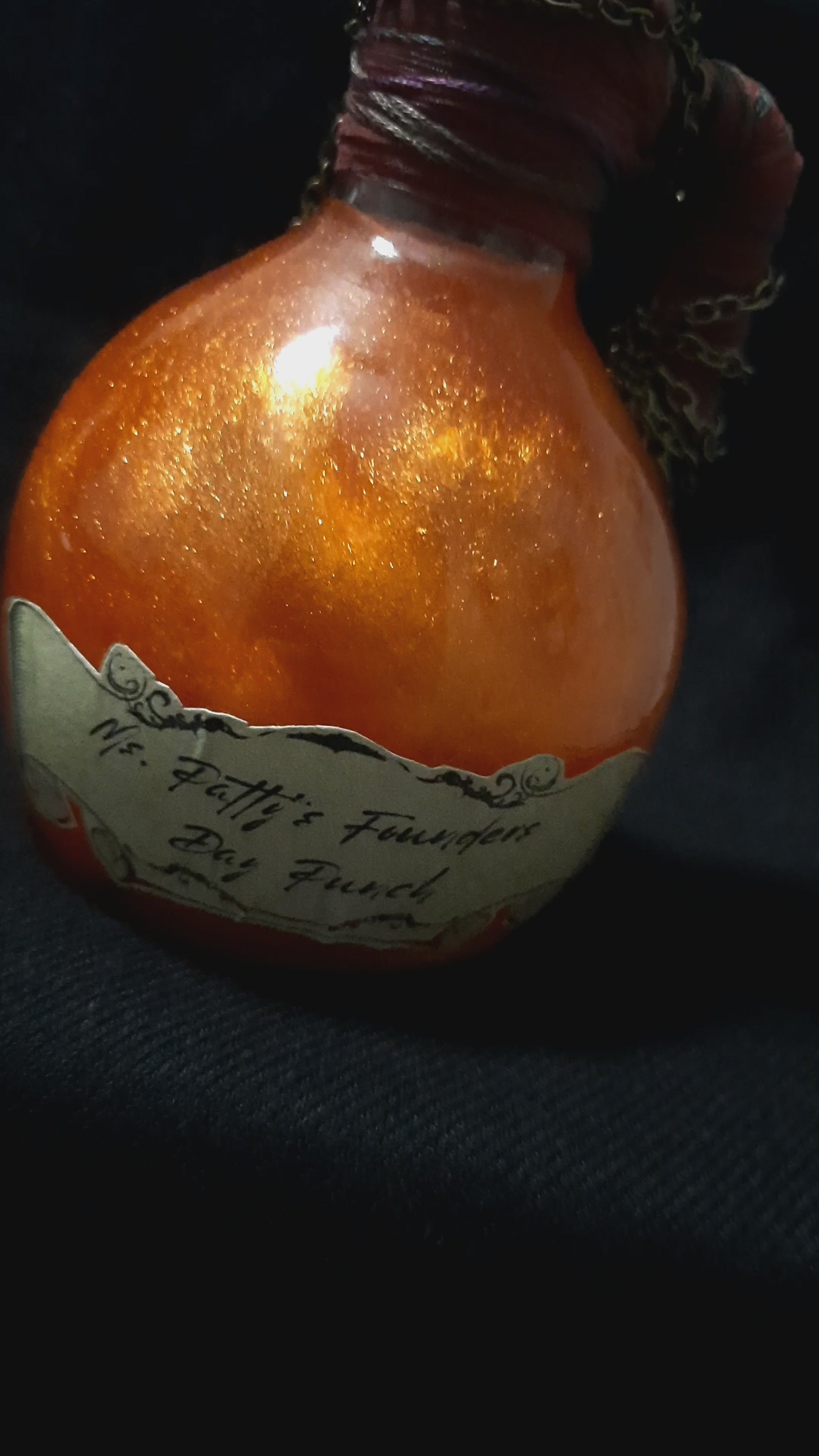 Ms. Patty's Punch is a beautiful glass decorative bottle filled with a red potion that swirls to a shimmery golden when shaken. The shimmer will settle back down to the bottom of the bottle in about 10 minutes, until shaken again. This bottle is adorned with maroon ribbon, colorful cord, bronze chain, gold and purple beads, and 1 bronze acorn charm. The bottle is sealed with maroon wax with a gold starlight stamp. This bottle screams Ms. Patty.