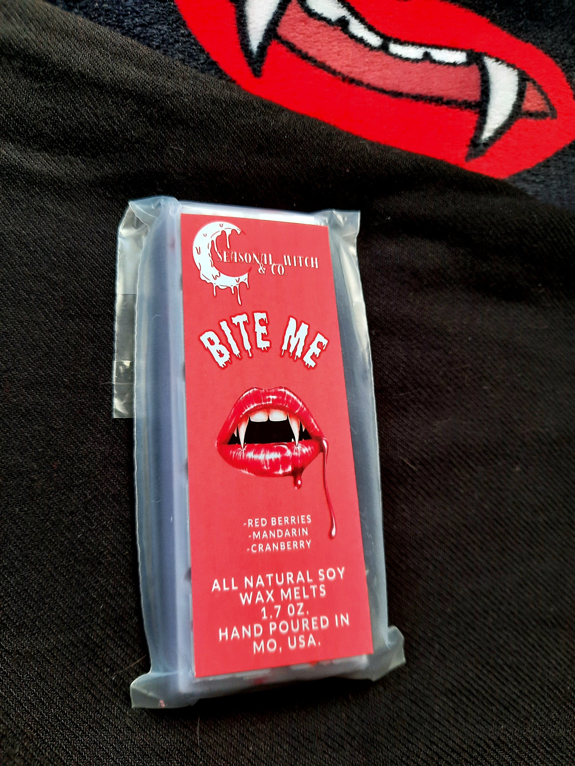 Sweet temptation with a dangerous edge. Each Bite Me wax bar fills your space with the seductive scent of red berries and bright mandarin, balanced by cranberry-scented broken-heart pieces that melt into perfection.