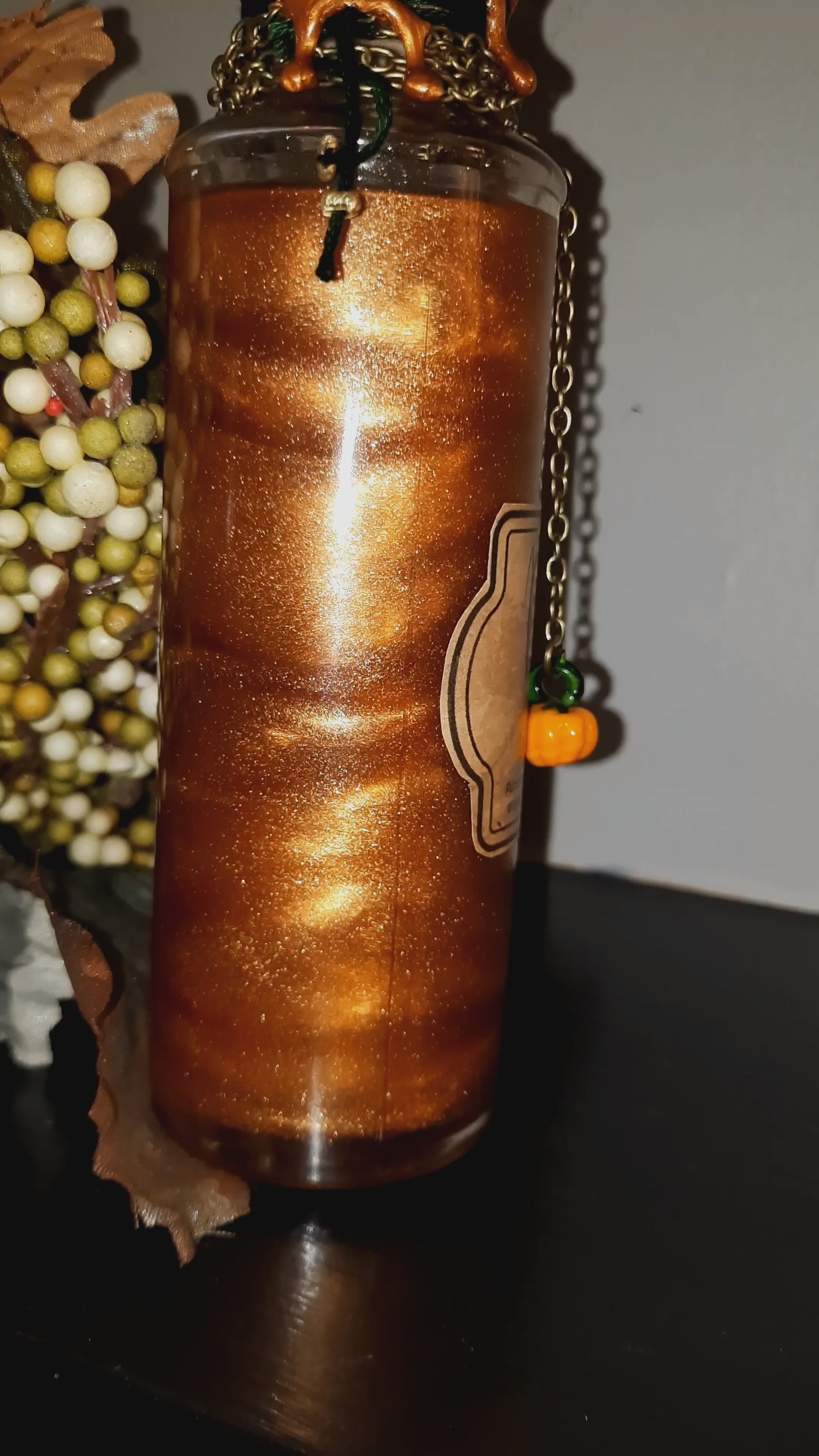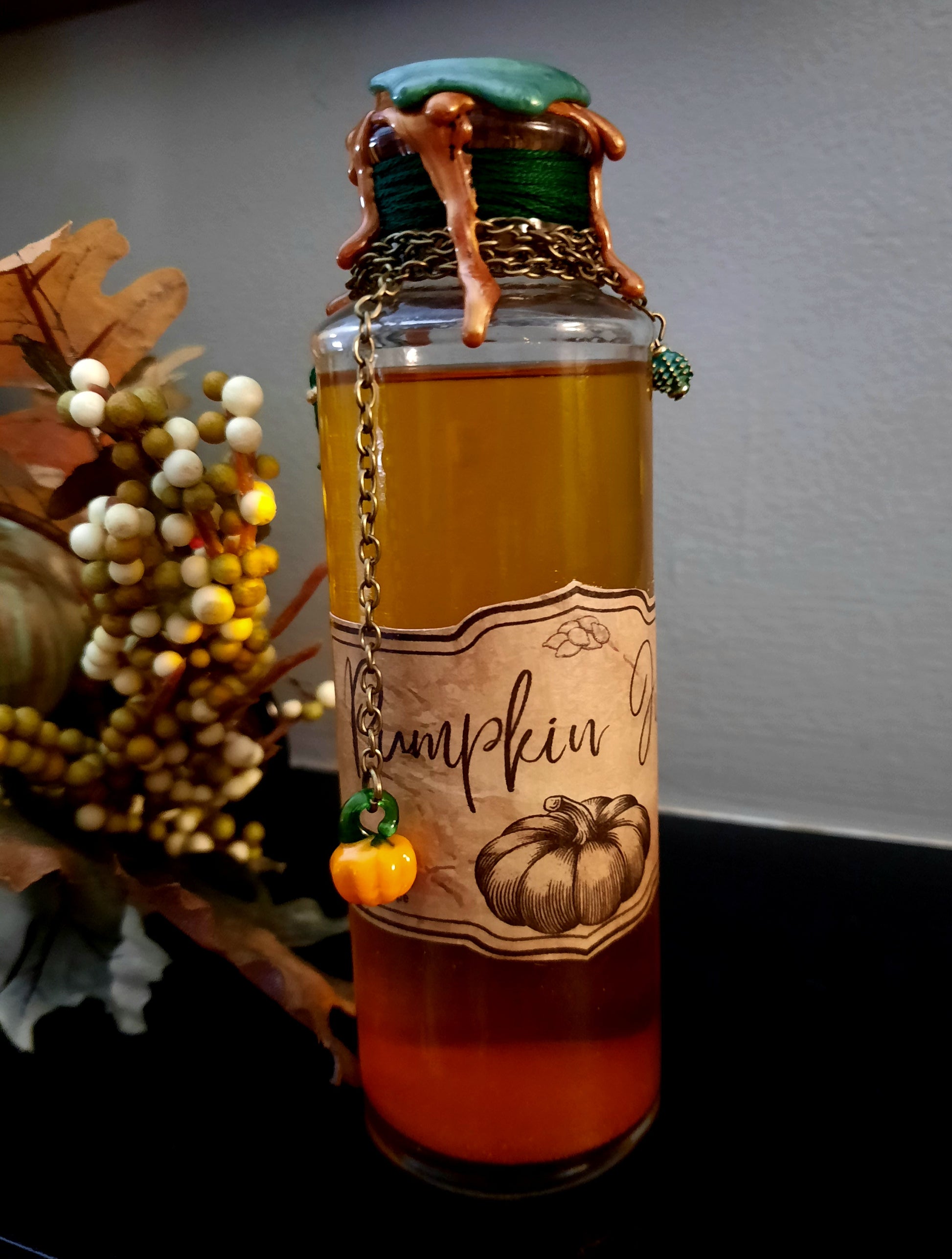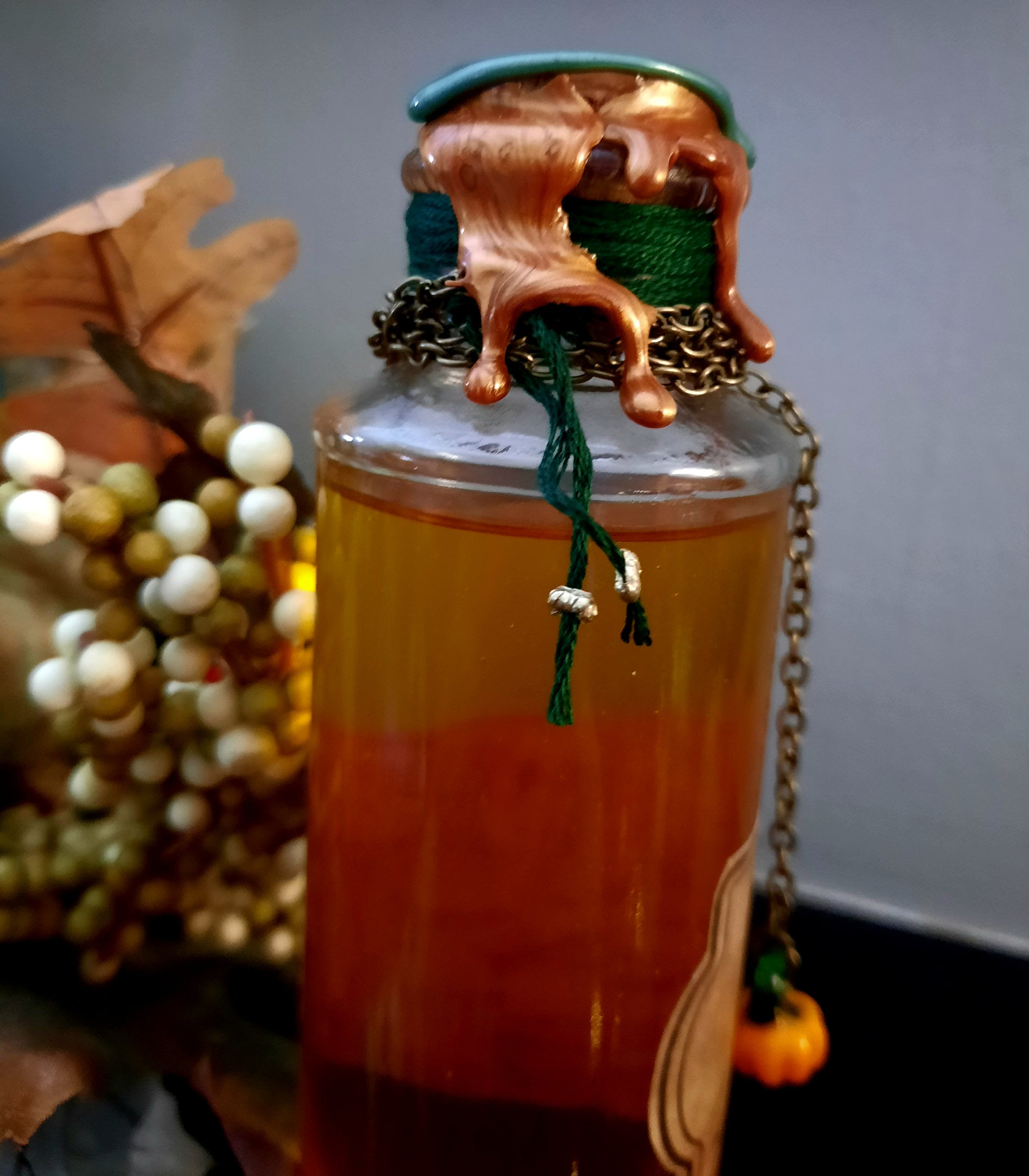 Dark green thread, and bronze chain adorn the neck of the bottle, with a glass pumpkin charm, and decorative gold and green bead. Sealed with green and bronze wax, and a pumpkin stamp.