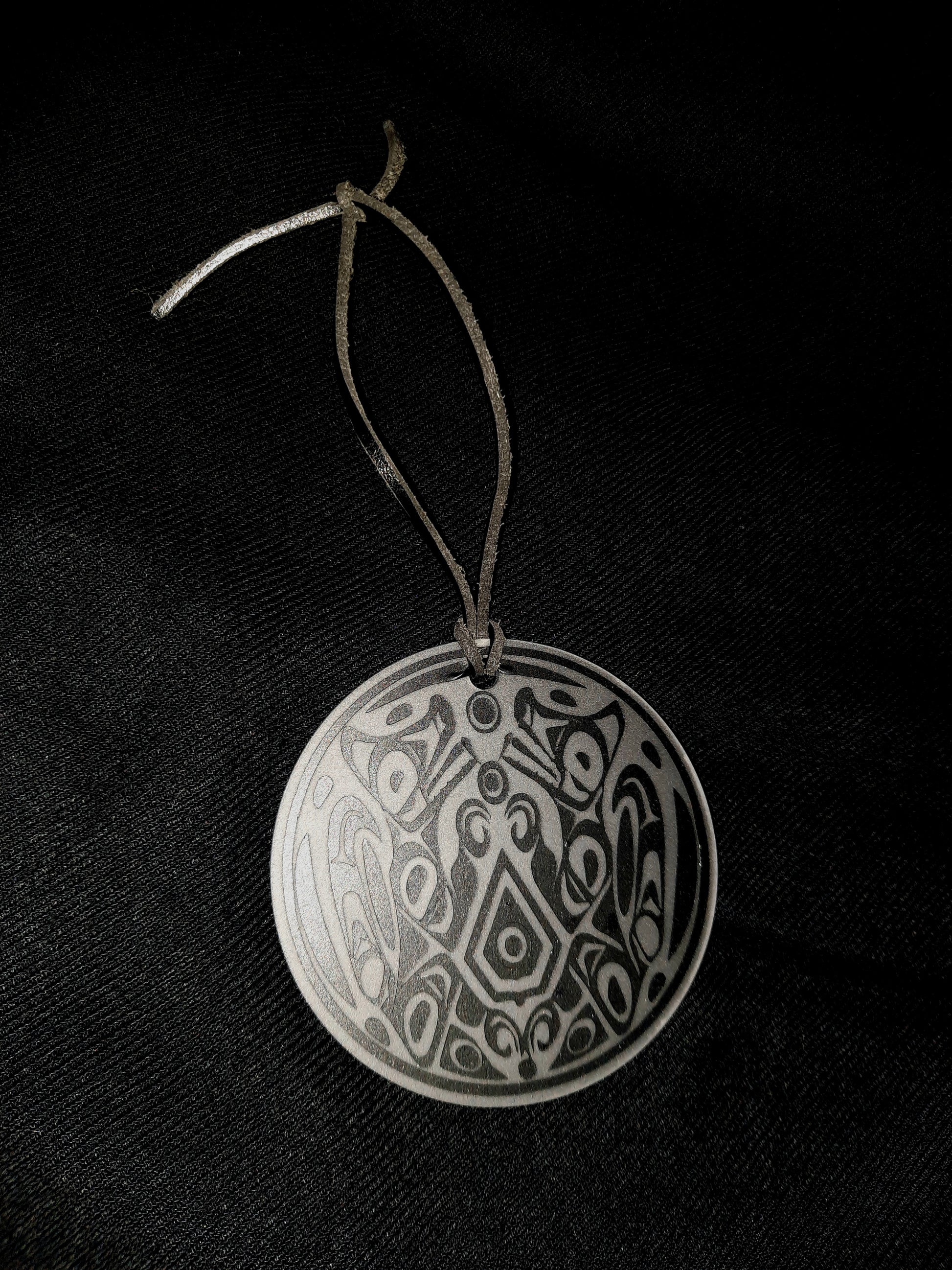 Made on a 3x3" acrylic round with black matte vinyl, and a leather tie.