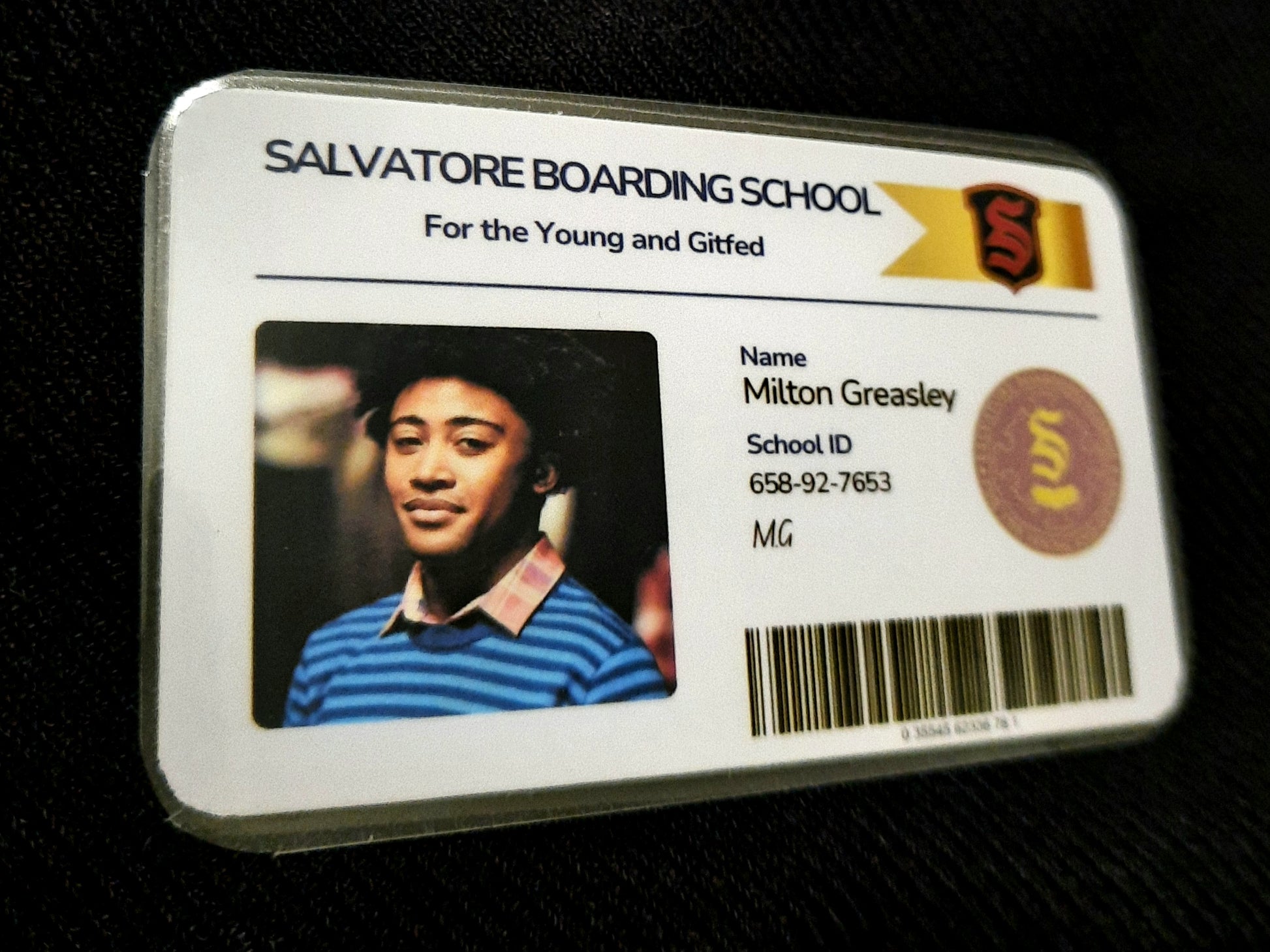 Salvatore Boarding School student ID card- Milton Greasley (MG)