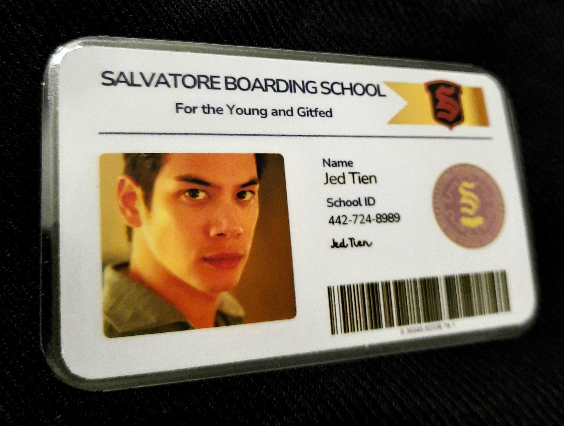 Salvatore Boarding School student ID card- Jed Tien.