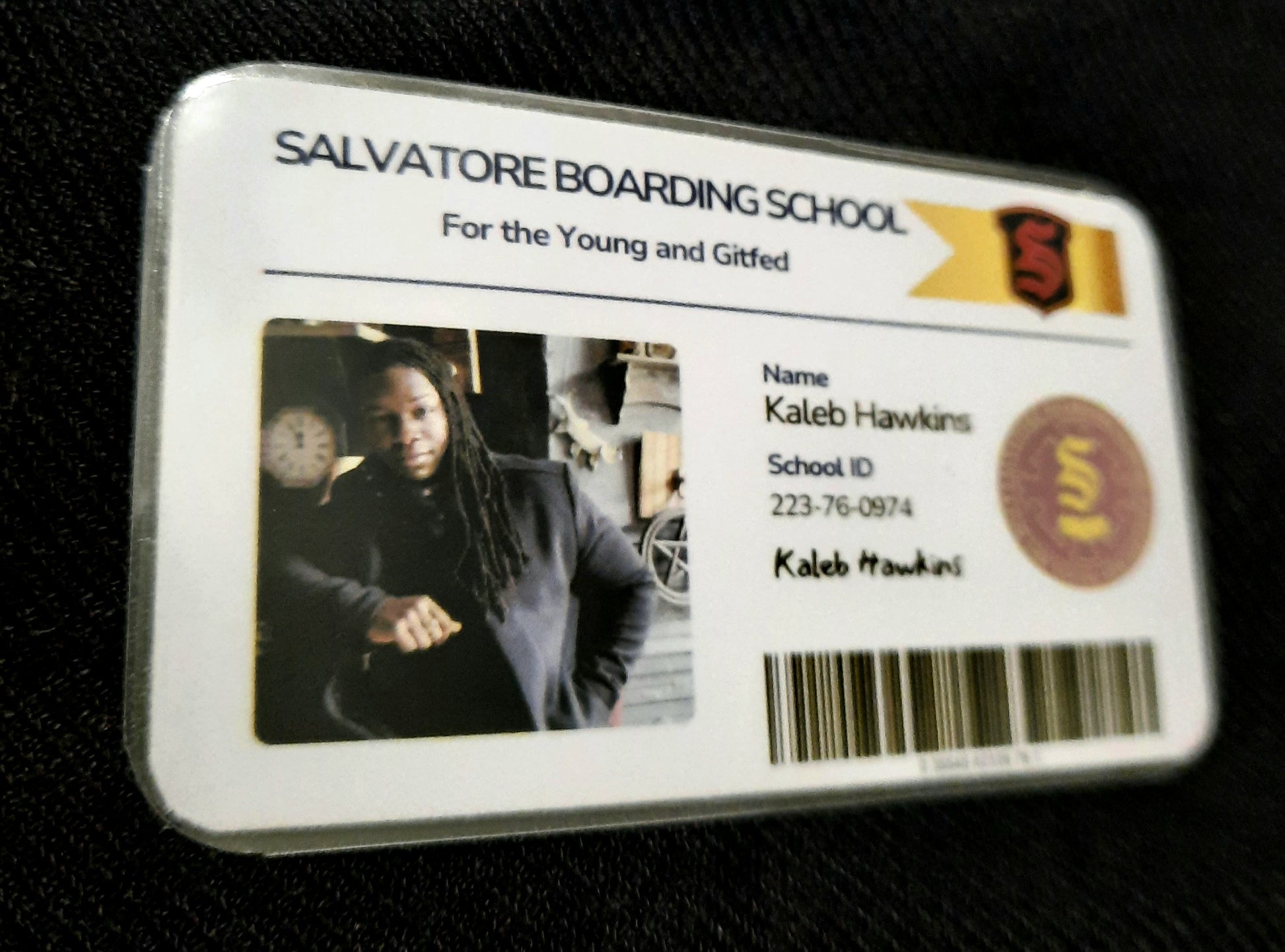 Salvatore Boarding School student ID card- Kaleb Hawkins.