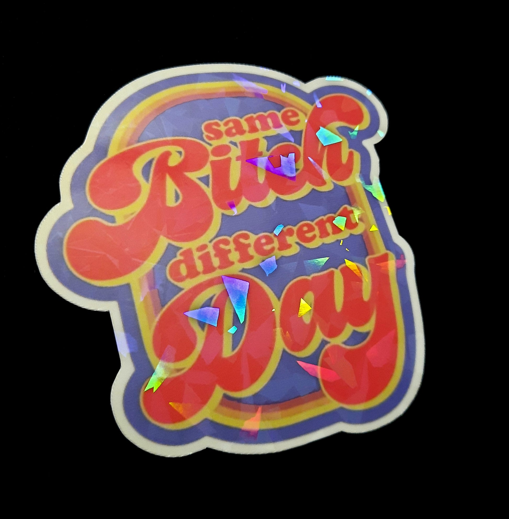 Same Bitch Different Day Sticker. Made with holographic laminate.