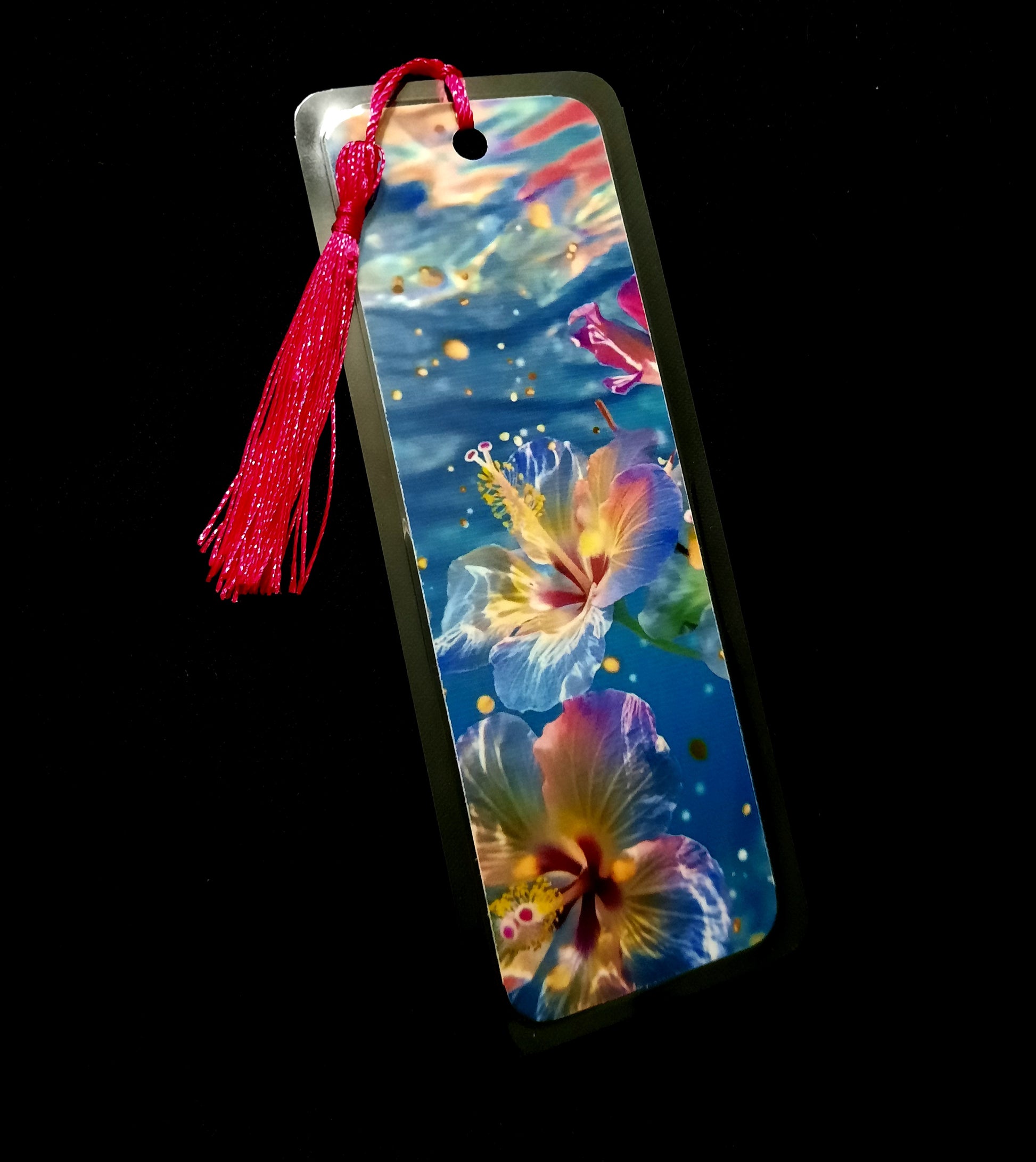 Summer bookmark featuring the ocean and Hawaiian flowers.
