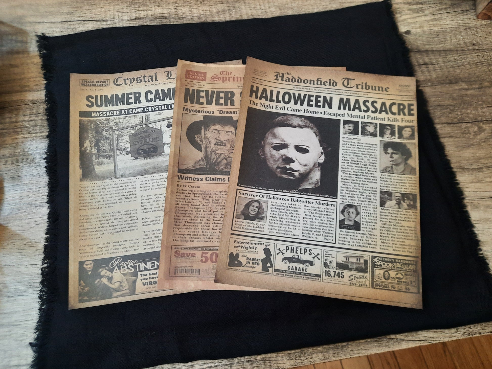 Step into the chilling world of classic horror with this 3-page aged newspaper replica set, featuring the infamous icons that shaped nightmares for generations: