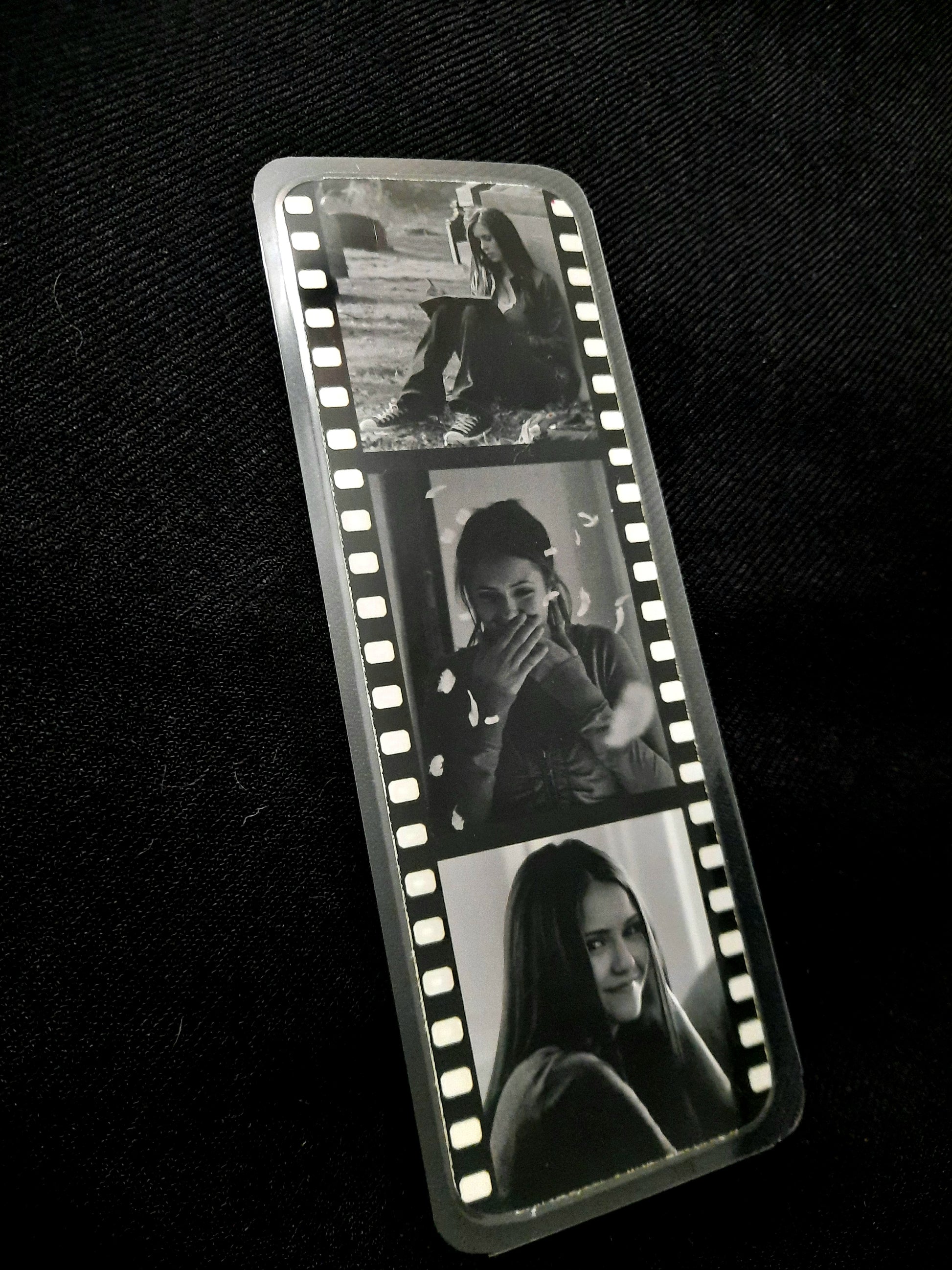 Celebrate your love for The Vampire Diaries with this sleek black-and-white Elena Gilbert film strip bookmark! Featuring three iconic scenes from the show, this bookmark is perfect for keeping your place in style. Durable, collectible, and designed for fans who can't get enough of Mystic Falls' favorite heroine.