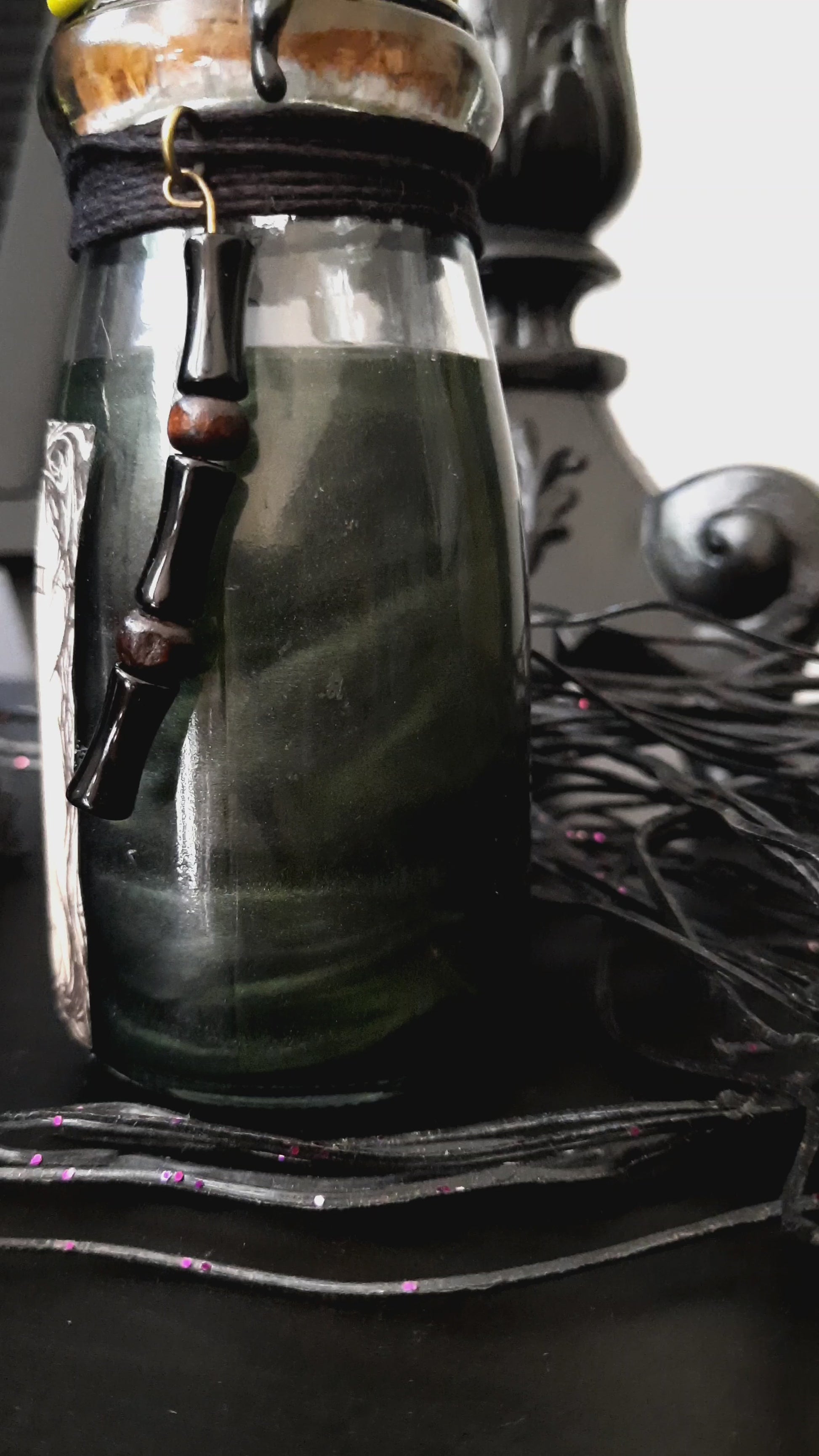 Glass bottle with color-changing liquid: Vibrant green shifts to a black shimmer when shaken.